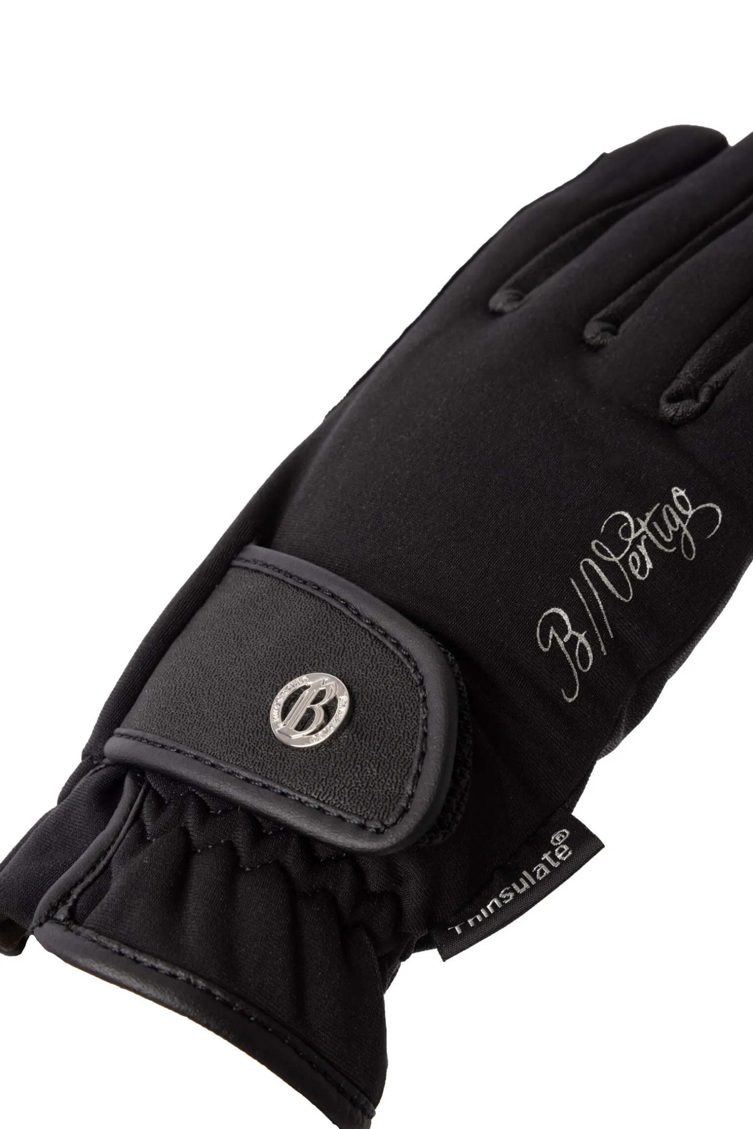Varme vinterridehansker med grep over hele innsiden av hånden som holder deg komfortabel på vinterturen. De elegante metallbokstavene og B Vertigo-logoen på trykkbåndet på håndryggen gir hanskene et unikt utseende. Elastisk bånd rundt håndleddet for sikker passform.