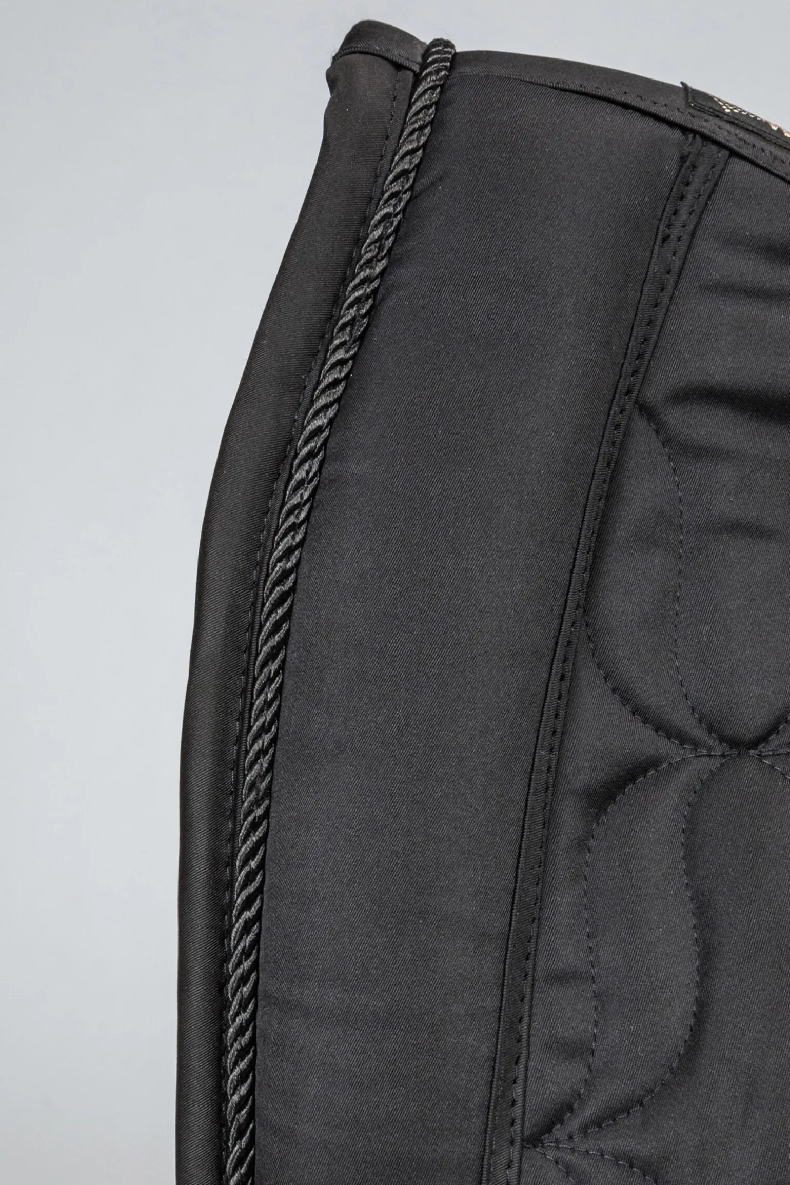 Deep Nights Saddle Pad Dressage er et sofistikert tillegg til den høyt verdsatte Nights Collection, tilgjengelig i kulsvart med svarte utsmykninger og et diskret logoemblem. Back on Track-vinge-insigniene er integrert i et quiltemønster som strekker seg over en svart, skinnende overflate – et diskret uttrykk for ren eleganse. Innsiden, nærmest hesten, er helt foret med Back on Tracks Welltex-infunderte Power Waffle-stoff – materialet som gir fra oss vår sterkeste refleksjon av infrarød energi. I denne nye versjonen er både utseende, følelse og funksjon oppdatert. Remmer for å feste seteputen til salen erstattes av skumfylte stoppputer som holder puten på plass og hindrer den i å skli bakover. Den innovative passformen gjør at puten fester seg til hestens anatomi og følger krumningen av ryggen, og løfter den tydelig over manken for å unngå trykkpunkter. Et fast lag filt under fyllet bevarer formen og hjelper til med å fordele vekt og absorbere støt.