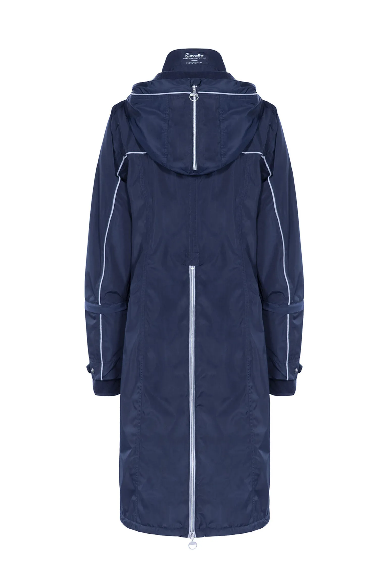 Bruna er en funksjonell, vanntett regn-ridejakke med mykt og behagelig, varmt, funksjonelt fleecefôr.Med en toveis glidelås er denne jakken perfekt til ridning.Glidelåsen er dekket med en flapp som lukkes med magneter.En lang glidelås med reflekterende kant bak åpnes som en ridesplitt.Reflekterende detaljer finner du også på ermene, brystet og hetten.Den store hetten kan fjernes ved trykknapper, og utvides til å passe over hjelmen.Jakken kan festes til beina med elastiske stropper og borrelåsfester.Cavallo-logoen finner du på venstre bryst og arm.Begge frontlommene har glidelåser for å holde dine verdisaker trygge.Regnbeskyttelse til salhornet finner du i glidelåslommen foran.