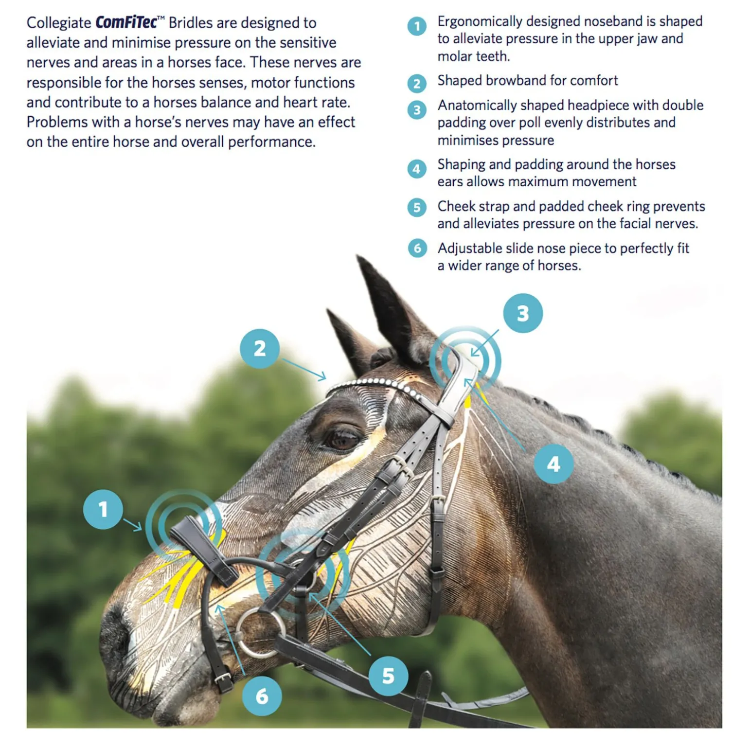 - Dobbel polstring over nakkeområdet minimerer press, og rundt ørene er polstringen formet slik at hesten får maksimal frihet og komfort