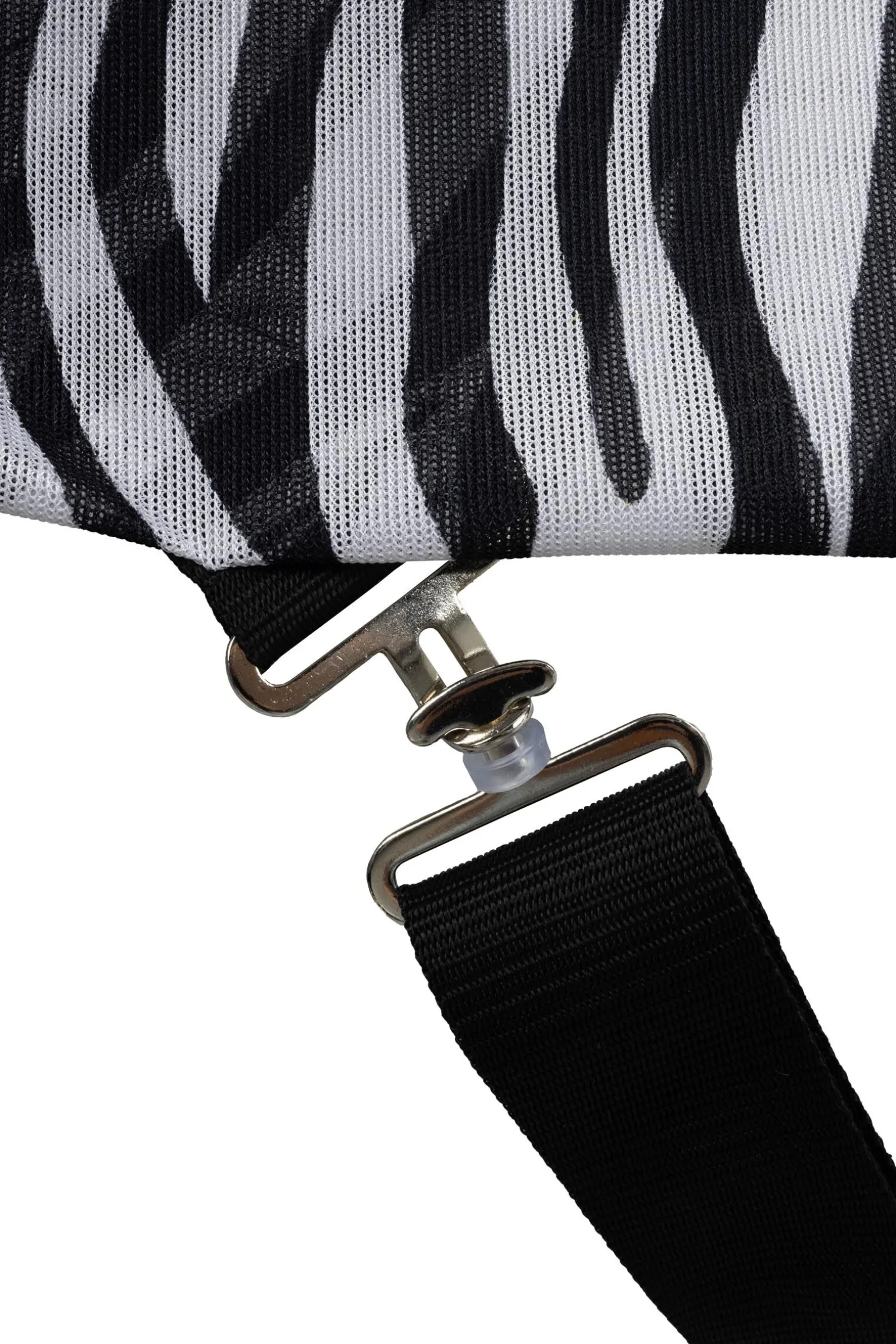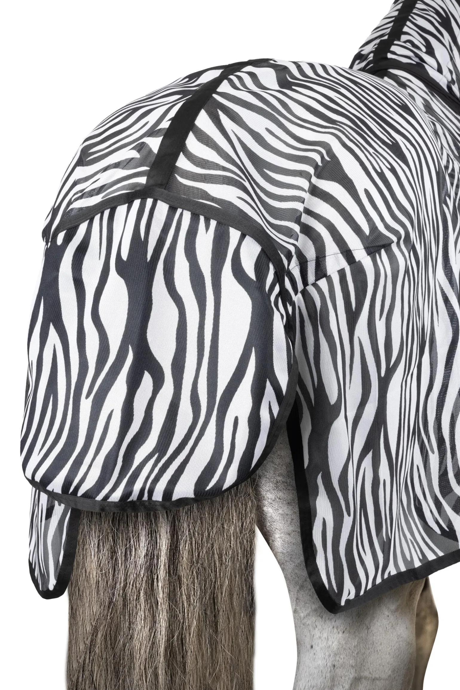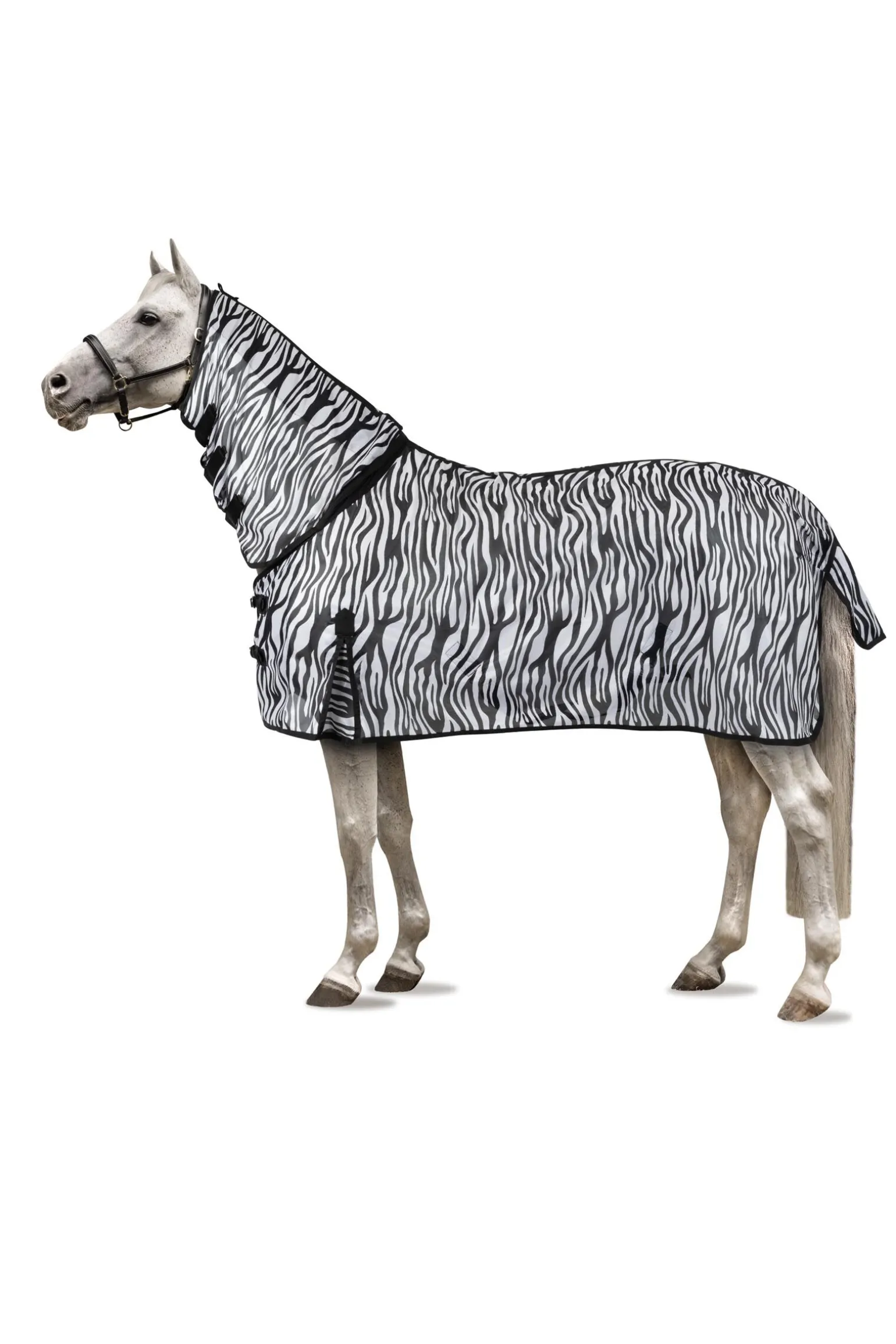 Expertly designed to give your horse day-long summer turnout protection, the Horze Defender fly rug is UV-protective and features a superb zebra print design which offers head to tail protection from annoying and biting insects. Zebra stripes are a highly effective deterrent against flies as the contrasting stripes have been shown to confuse and deter insects, helping to reduce bites and irritation.Made from a fully breathable fabric to ensure your horse stays cool and comfortable, it is also quick to dry, should your horse get caught in a shower. With a Elastan insert at the base of the neck for added stretch and comfort, the Defender fly rug also features a smooth lining along the extra-long neck and shoulder areas, to help prevent friction and ensure your horse is comfortable and protected, all summer long.
