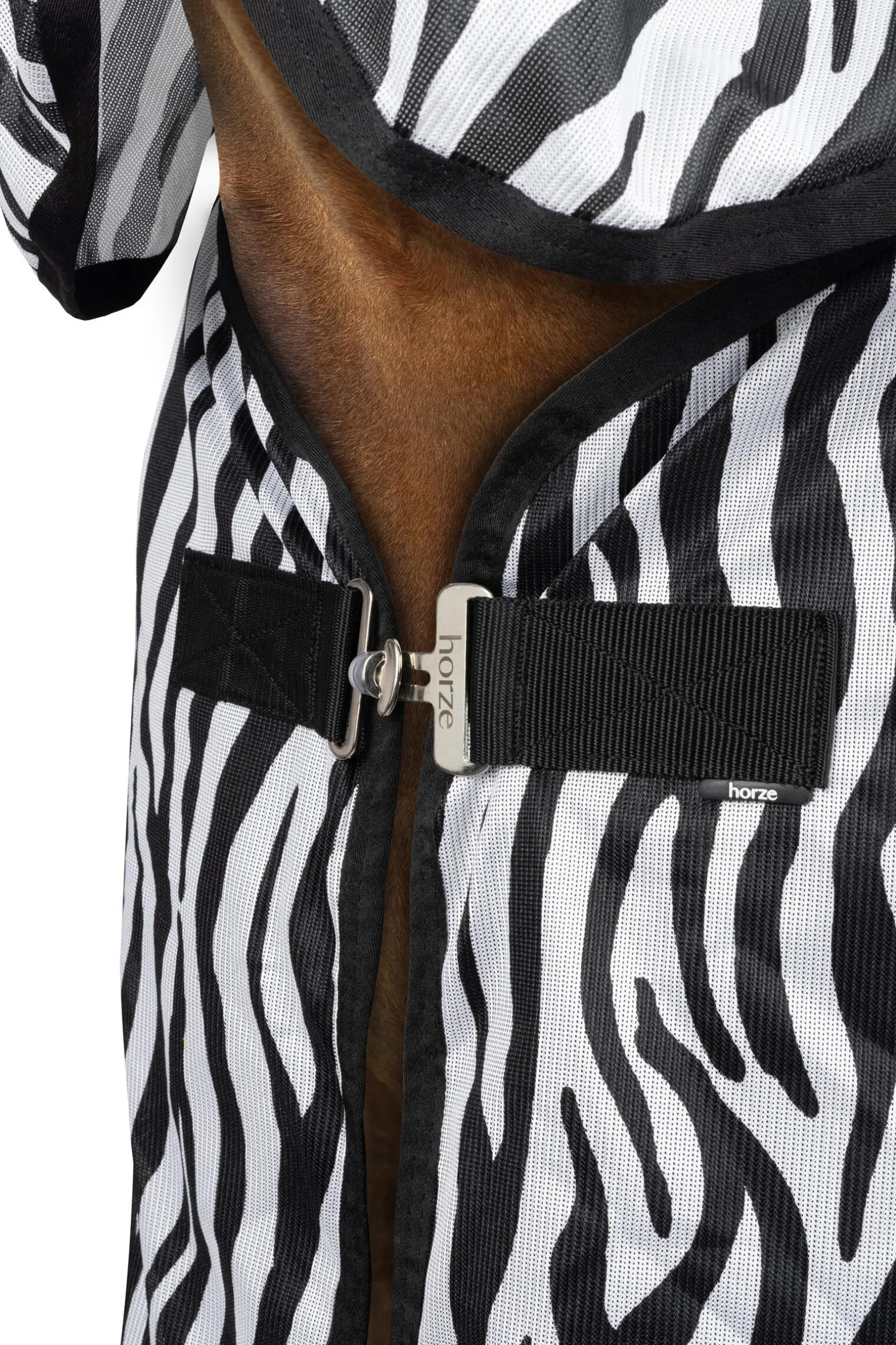 While we all love riding in summer, irritating flies and biting insects will certainly reduce the fun – for you and your horse. The Horze Defender riding rug is UV-protective and features a superb zebra print design which offers head to tail protection from annoying and biting insects. Zebra stripes are a highly effective deterrent against insects as the contrasting stripes have been shown to confuse and deter flies, helping to reduce insect bites and irritation.Fringes along the hem create a moving barrier that further deters flies, while the smooth lining along the extra-long neck and shoulder areas of this riding rug help to prevent friction.The fully breathable fabric ensures that your horse does not overheat, while the saddle shape cut-out and hook and loop-bridle loops offer security and an excellent fit, so you and your horse can ride on and enjoy the sunshine!