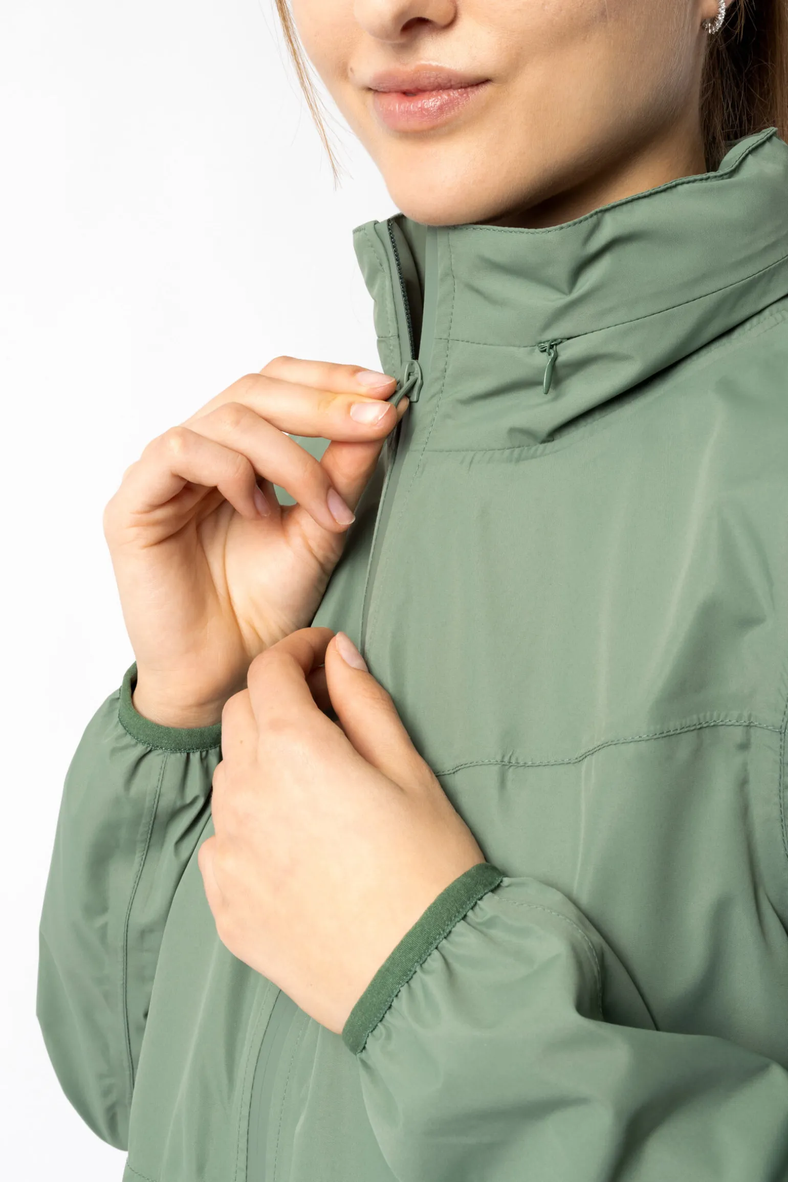 100% polyester, 3000mm/3000mvp vannsøyle, pustende. Teipede sømmer.