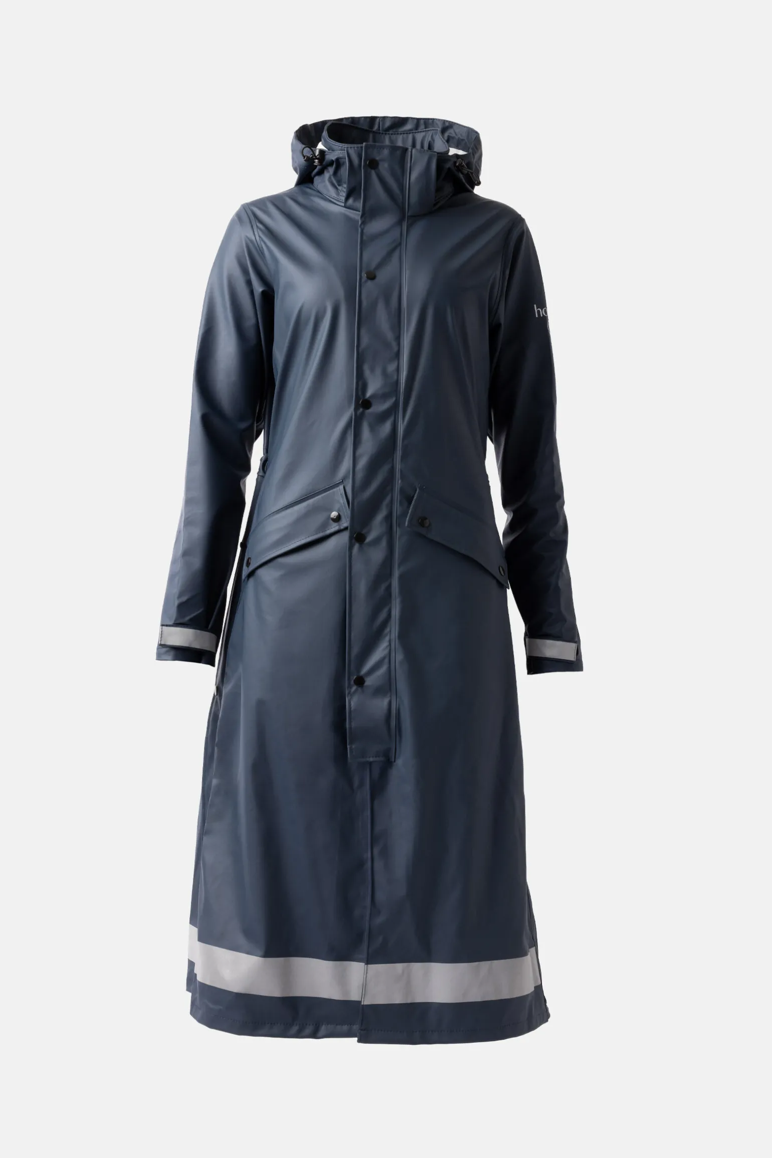Denne lange regnjakken gjør det morsomt å ri i regnet.Den har splitt på sidene som lukkes med trykknapper.Dette gjør det lett å enkelt åpne jakken over lårene og salen slik at du holder de tørre i regnet.Beinsnorer på innsiden holder den vanntette kanten på plass når du rir.Hetten beskytter hodet og kan fjernes når regnet stopper.De justerbare ermene og elastikken bak sikrer at denne regnjakken har en perfekt passform og fleksibilitet.Reflekterende striper på hetten og nederste kant gjør at du er synlig i mørkt og grått vær.Store lommer holder eiendelene dine trygge og tørre.