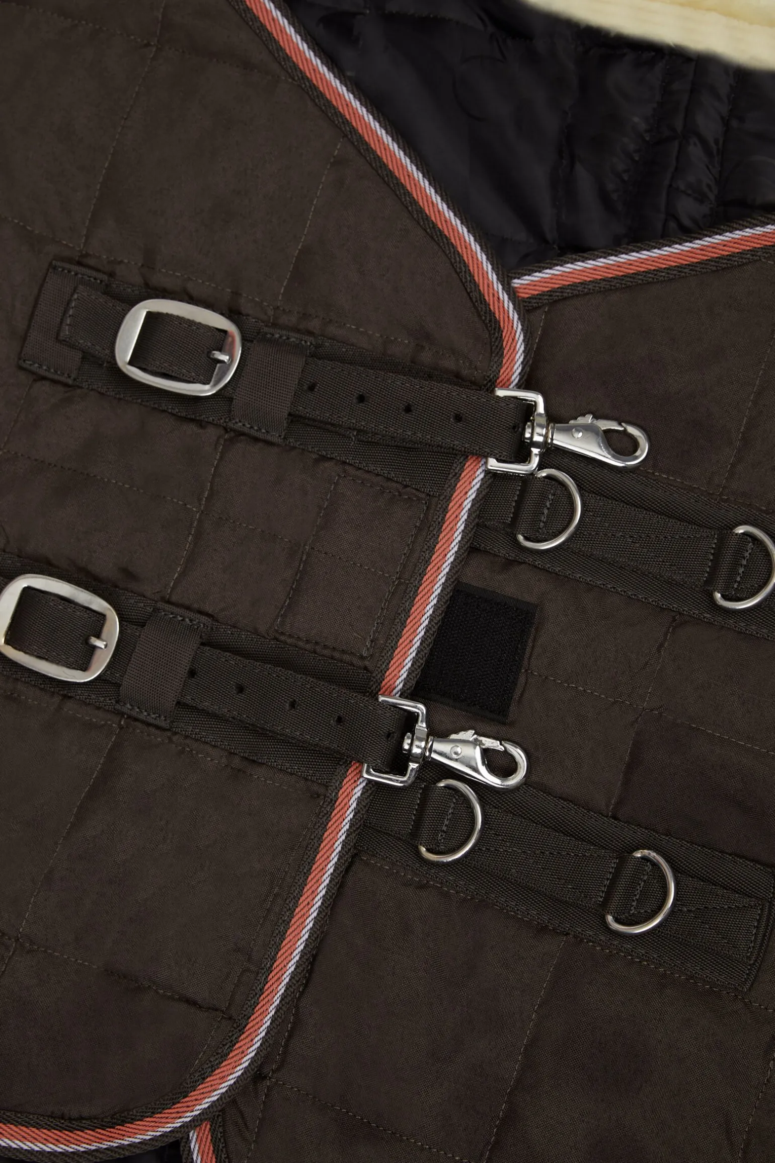 Vårt Horze Lucerne stalldekken er laget av et varmt materiale, og designet for perfekt passform.Fuskepels på manken gir ekstra komfort.To frontspenner, kryssgjorder og halestropp holder dekkenet på plass, mens de høye bogsplittene med elastikk gjør at hestens bevegelser ikke begrenses.