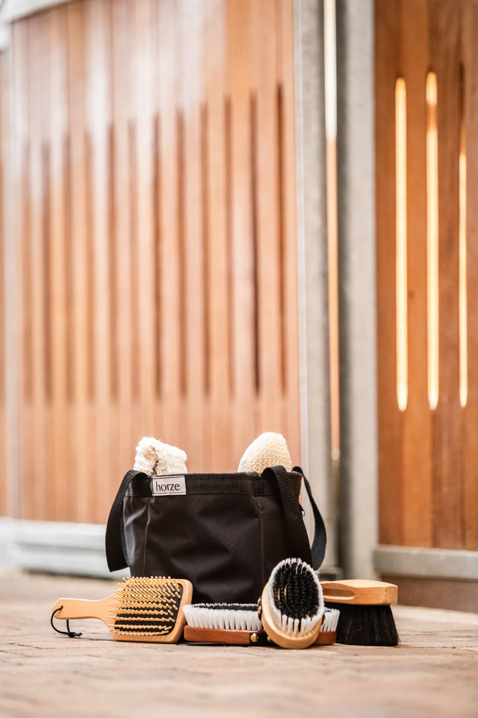 Hold pussesakene dine i orden med denne praktiske vesken. Denne holdbare nylonvesken kommer til deg med seks pussesaker i høy kvalitet. Stor kroppsbørste med trehåndtak, fjerner skitt, støv, tørket svette og flass fra pels og hud. Medium kroppsbørste med trehåndtak, fjerner skitt, støv og smuss fra pels og hud. Mindre enn den store kroppsbørsten slik at den kan brukes på hodet og andre sensitive områder. Finbørste med trehåndtak, fjerner store mengder skitt og tørket gjørme. Man og halebørste med trehåndtak, fjerner floker i man og hale (løsne de største flokene først). Sisal-hansker som fjerner flekker, eller for en siste finish etter du har børstet. Også godt for å gni vekk svettemerker. Sisalhåndkle for den siste avslutning! Få en nydelig, skinnende overflate og tørk vekk de gjenværende merkene.