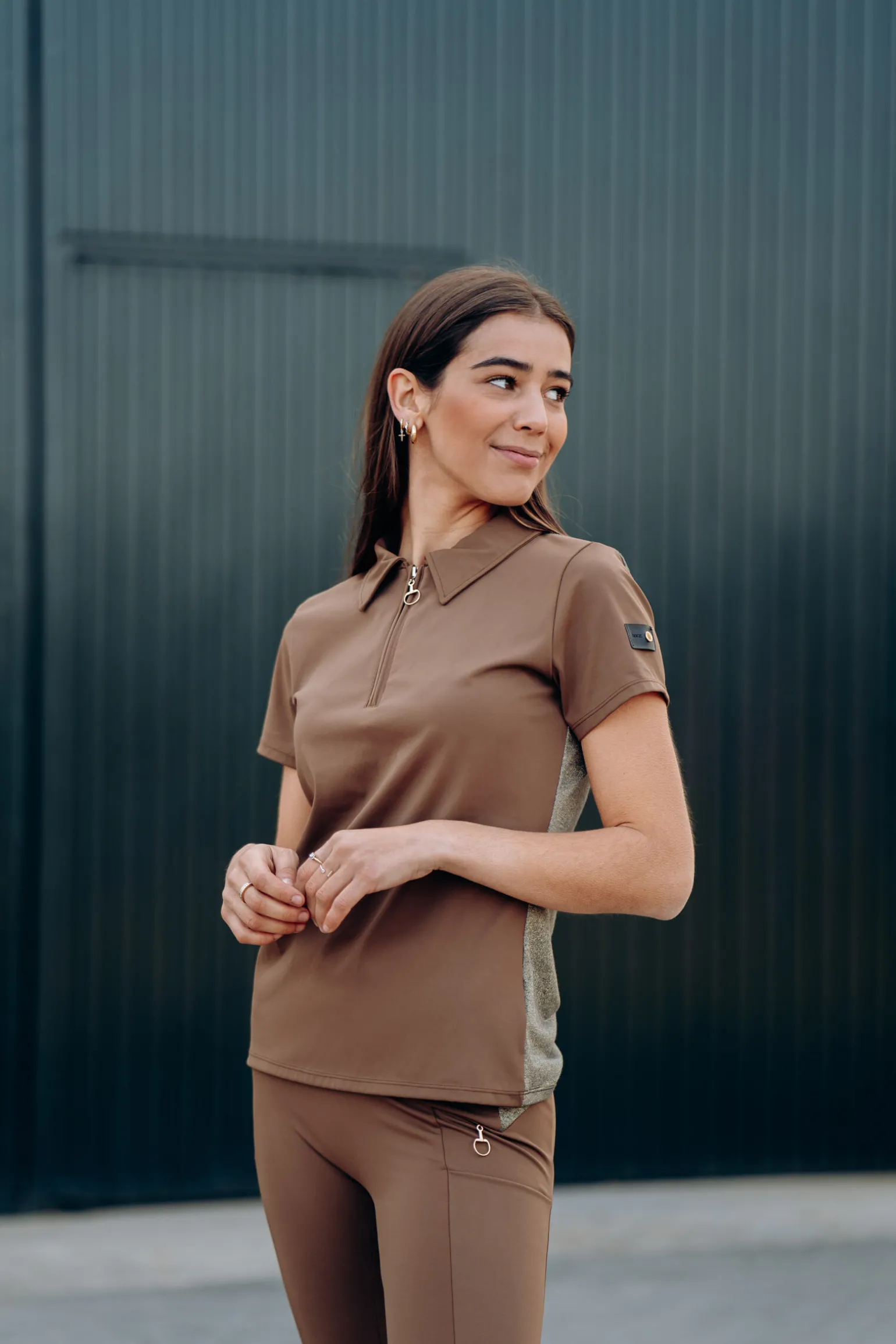 Vår pustende, hurtigtørkende Horze Sagria treningsskjorte er designet i en klassisk passform.Ryggen er helt laget av mykt, gyllent stoff som er en flott detalj.Lett materiale gjør den passende for trening.Glidelåsen i gull gir ekstra ventilasjon.Bruk denne skjorten med vår Horze Sagria ridetights for et komplett antrekk.