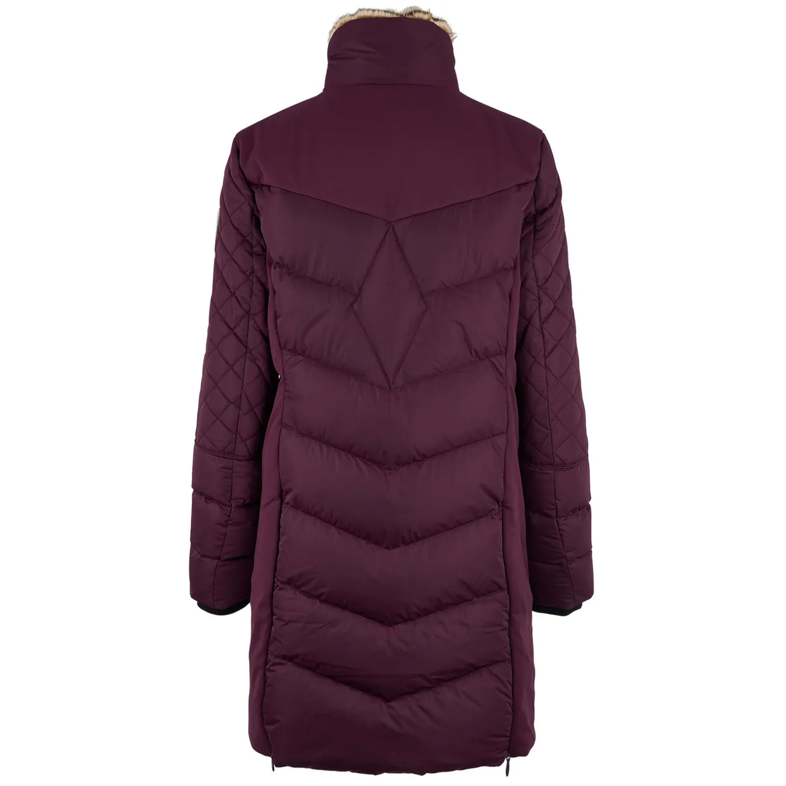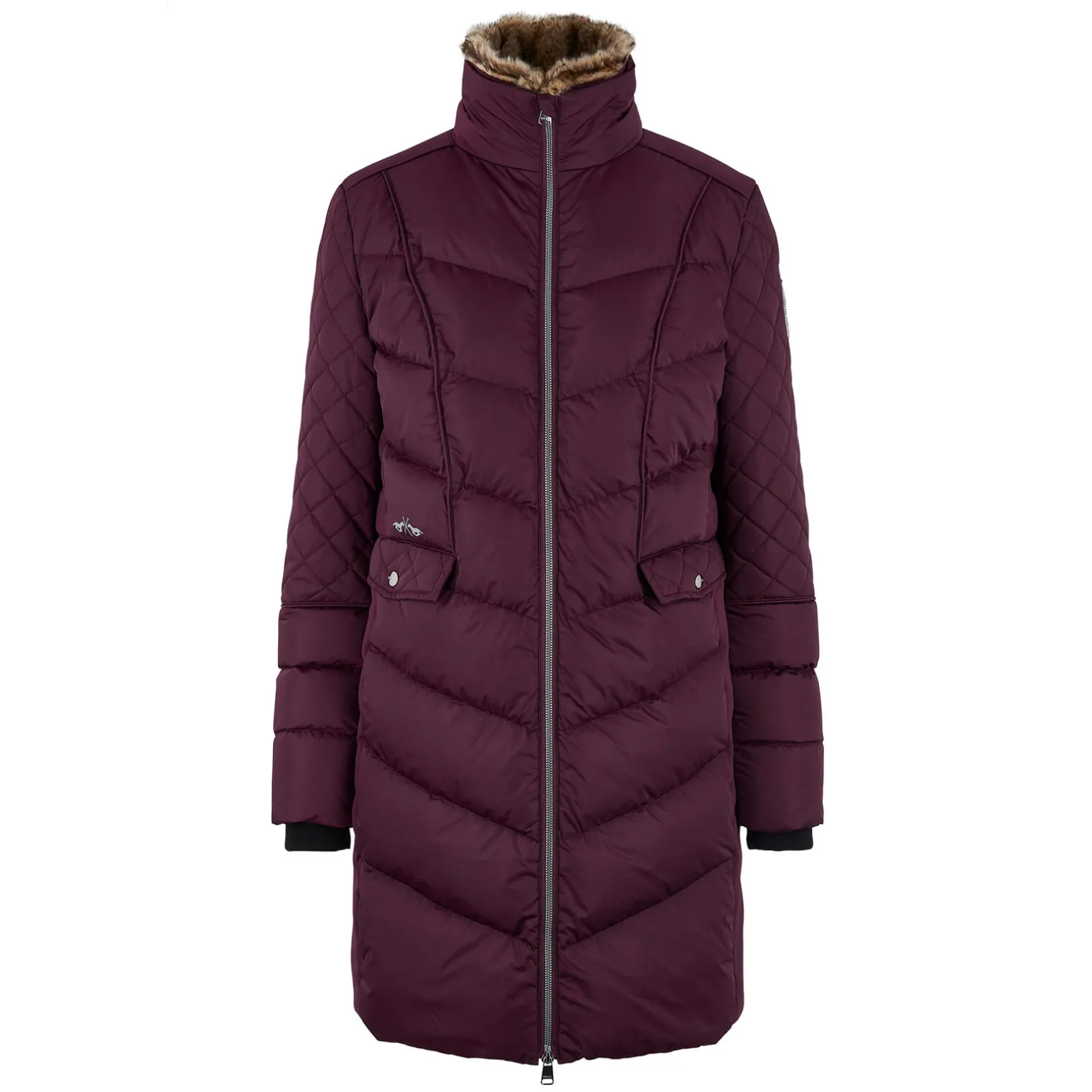 Water resistant quilted heavy padded parka jacket, with padded softshell side insert and windcatcher cuff for a sporty fit. Fake fur lined collar and fleece lining at upper body for extra warmth. Mirror look zipper 2-way front zipper and side slit zippers for fitting jacket over saddle, 4 hand pockets and inside pocket.
