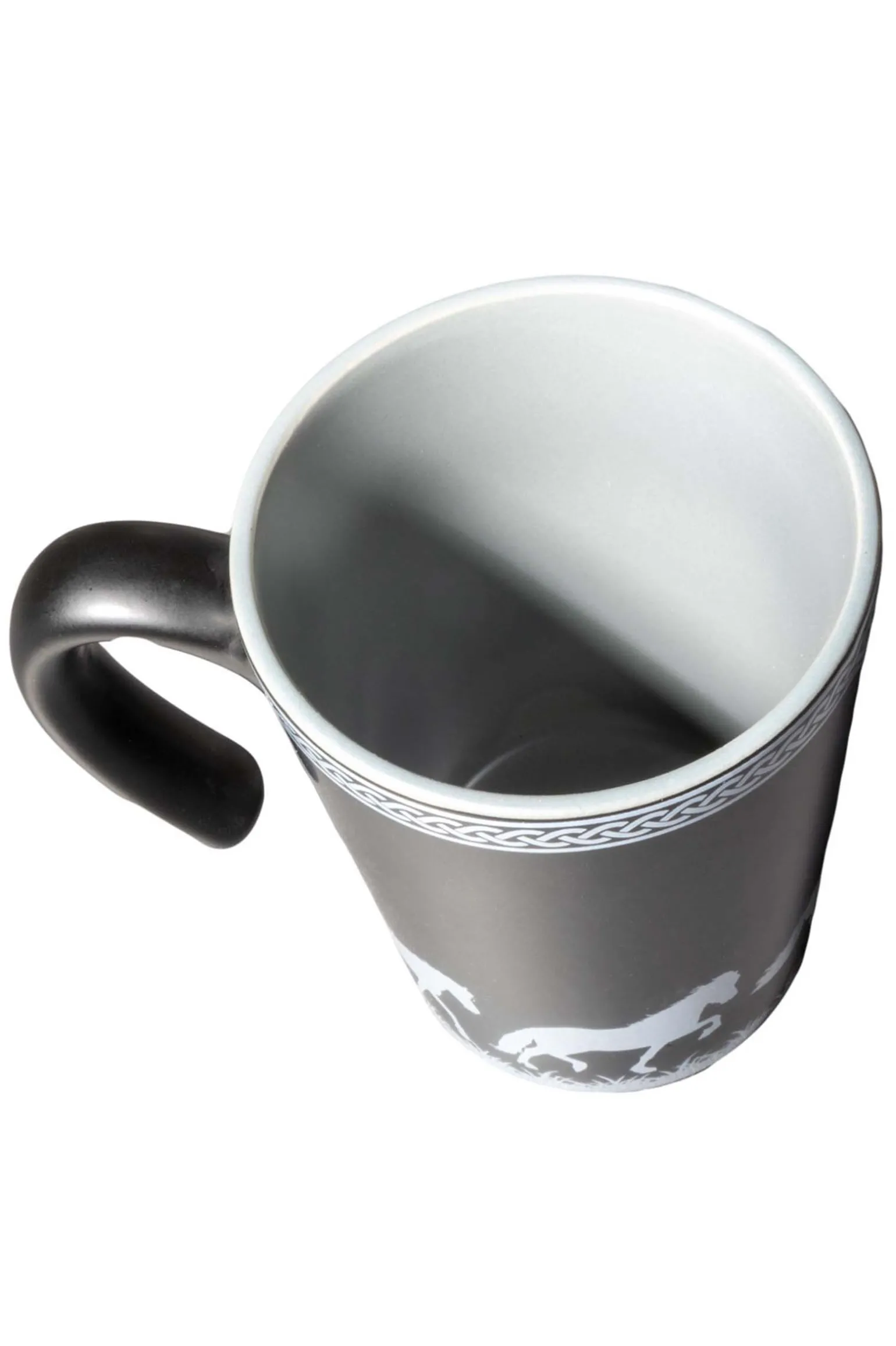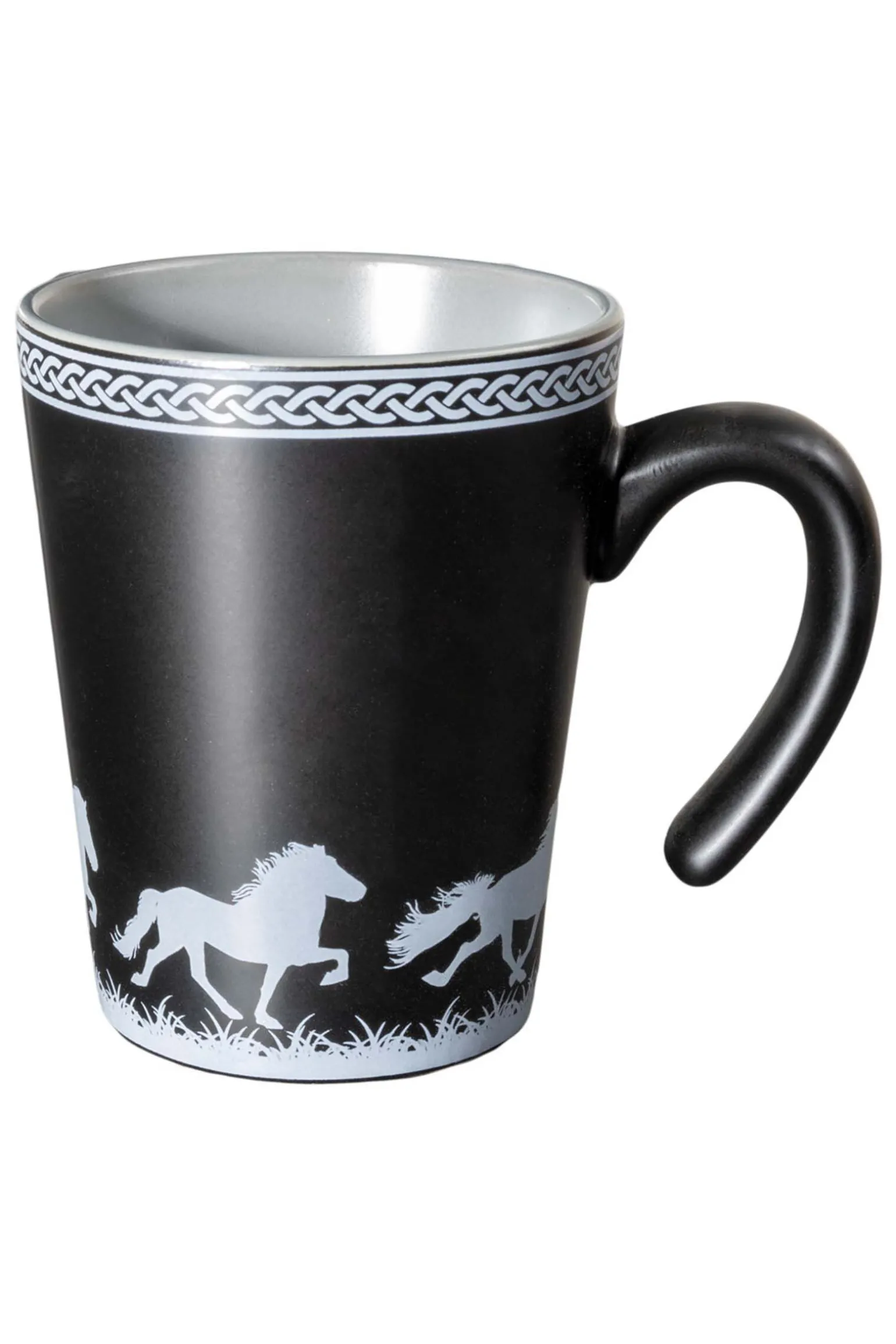 Nydelig kopp med de fem gangartene på.PasserF.eks:Kaffe og te og er laget av ekte steintøy.Ny modell med elegant, matt, svart overflate.