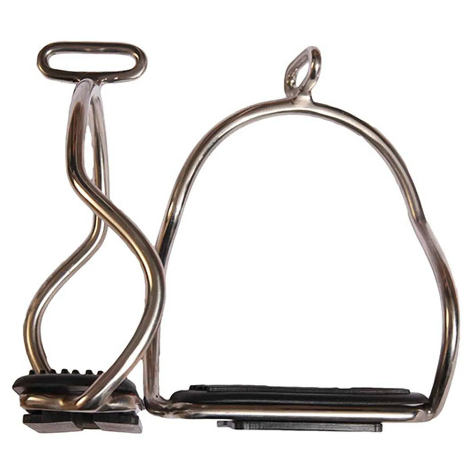 Dobbelt S sikkerhetsstigbøyler i rustfritt stål. Gummi plater med töltende hester.