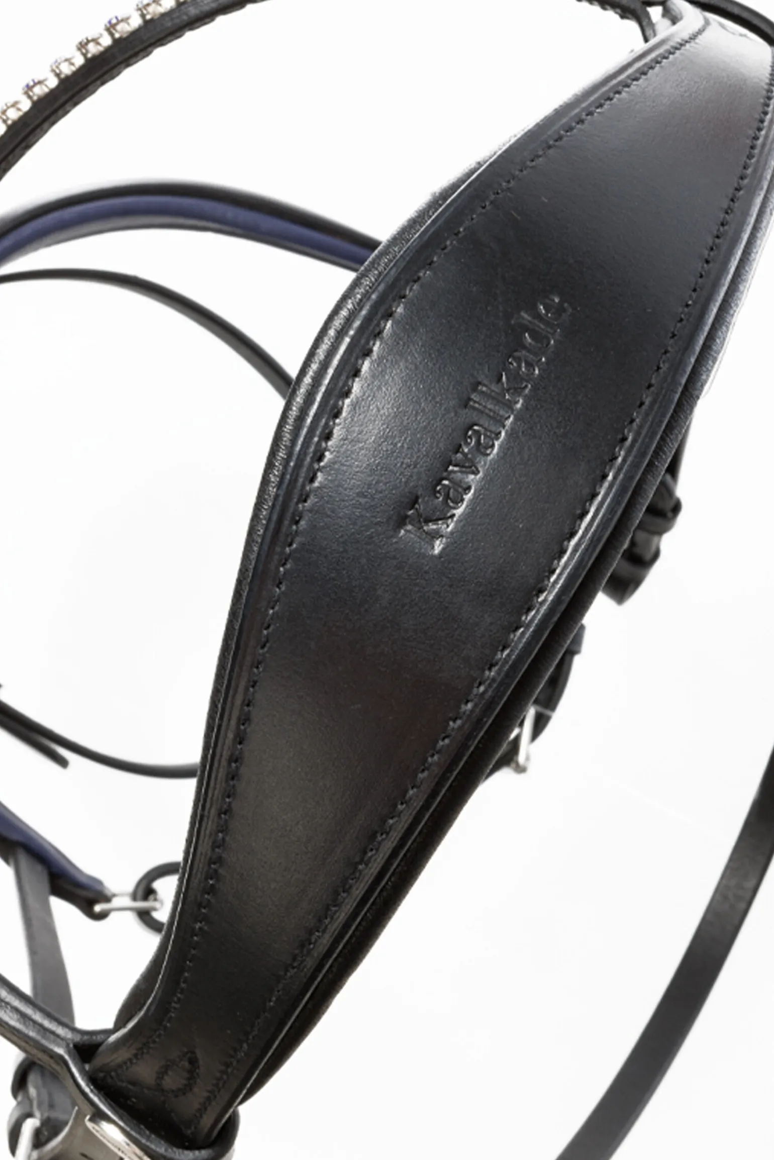 Det moteriktige hodelaget «Ocean» KavalSH4 med sin mørkeblå kantede nesereim og glitrende blå rhinestener på pannereimen er laget av høykvalitets lær og kan justeres på begge sider for optimal passform. Nakkestykket er anatomisk formet og ekstra bredt for å gi mer ørefrihet. Nesereimen er mykt polstret og anatomisk skåret. Gummibelagte tøyler med stoppere (16 mm). Matchende sporeremmer. KavalSH4 窶»KavalSH4″ er hodelag der nesereimen kan fjernes. Det spesielle med dette er at festet for nesereimen ikke er synlig, i motsetning til konvensjonelle hodelag med avtagbar nesereim.