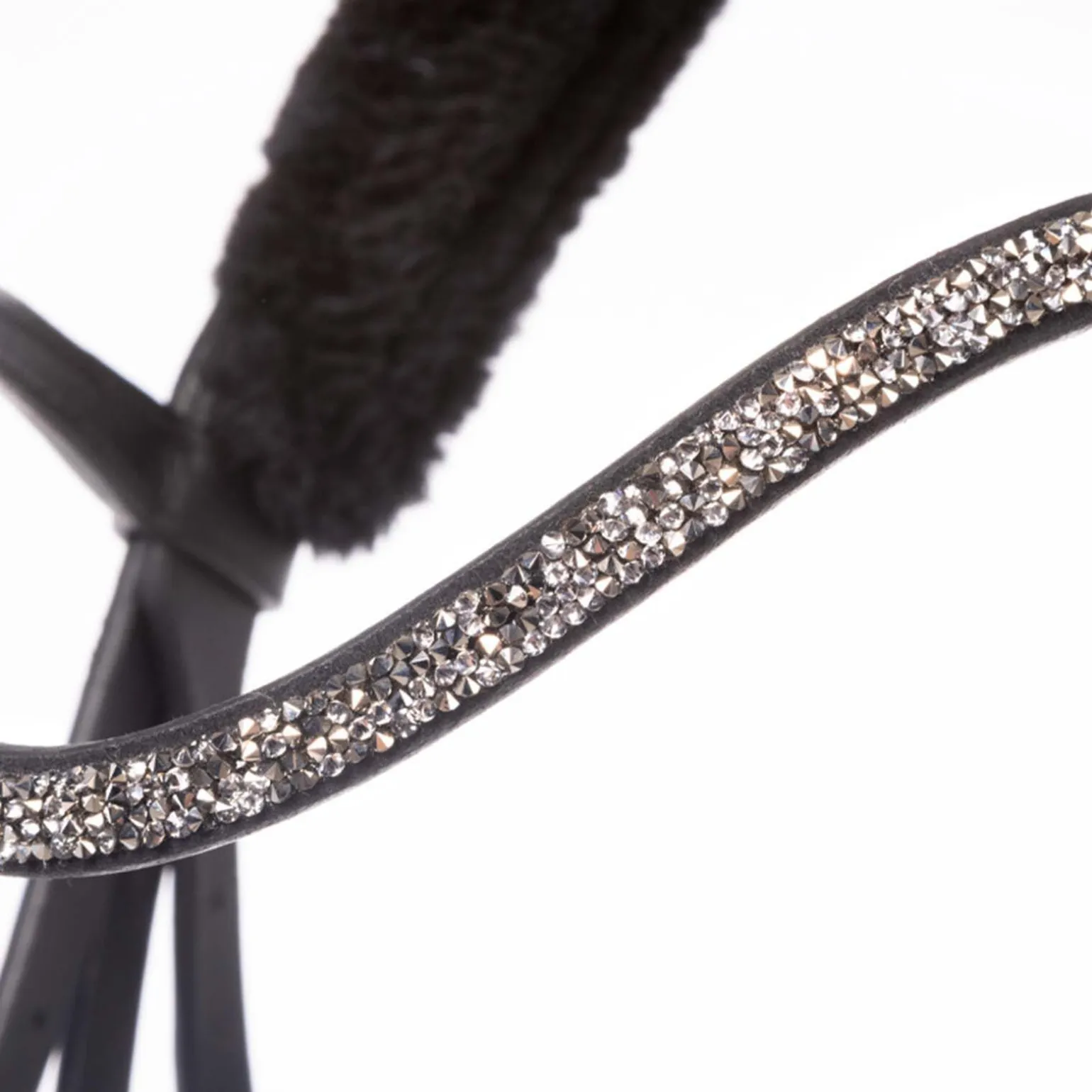 - Mørkegrå spenner, smalt pannebånd med glitter, svart, blankt lær på nesereima