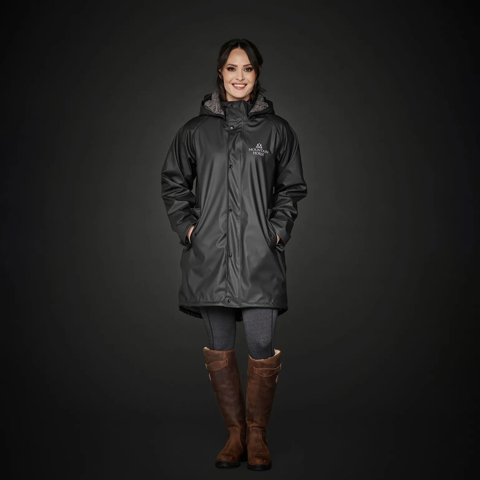 Denne helt vanntette regnfrakken med sveisede sømmer vil holde deg tørr selv i det kraftigste regnværet.Fôret med mykt, behagelig pile-stoff som er komfortabelt å bruke.To store frontlommer som er perfekte for å oppbevare hestegodbiter eller telefonen din.Ridesplitten bak kombinert med toveis glidelås gjør denne frakken perfekt til ridning.Reflekterende detaljer gir nok synlighet i mørket.