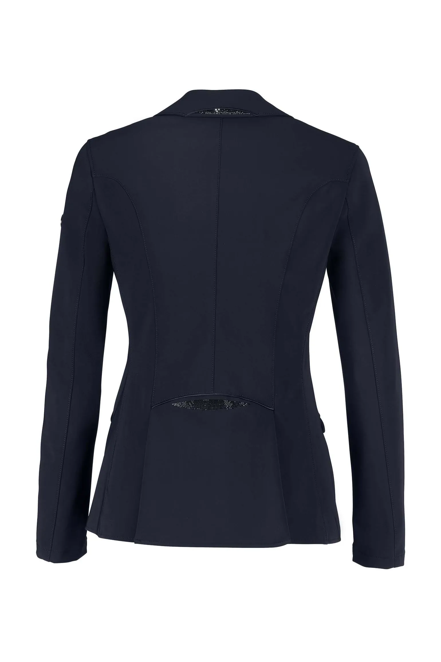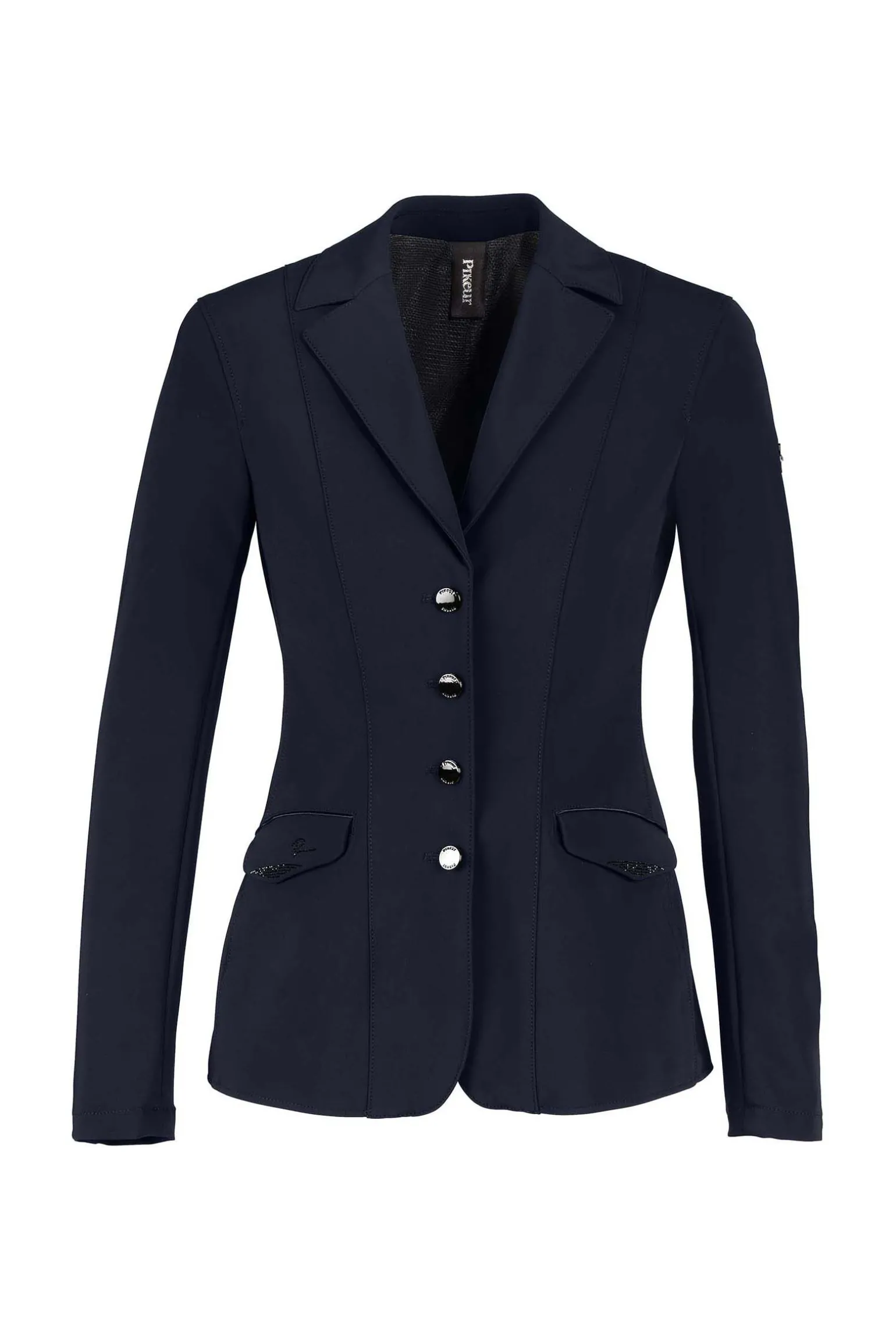 - Lommer med diskrete, matchende applikasjoner med pyntesteiner, og delikat satengbånd som også finnes på kragen og bak i livet