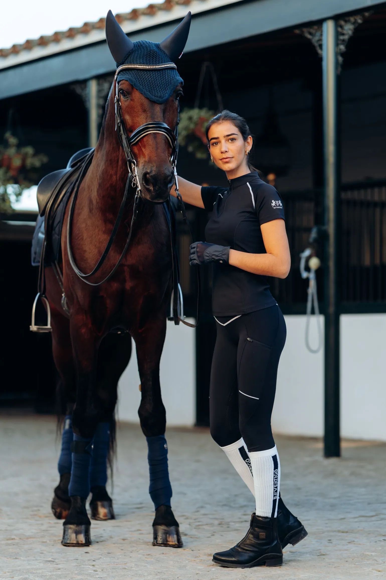 Pustende, knehøye ridesokker med B Vertigo-logo.