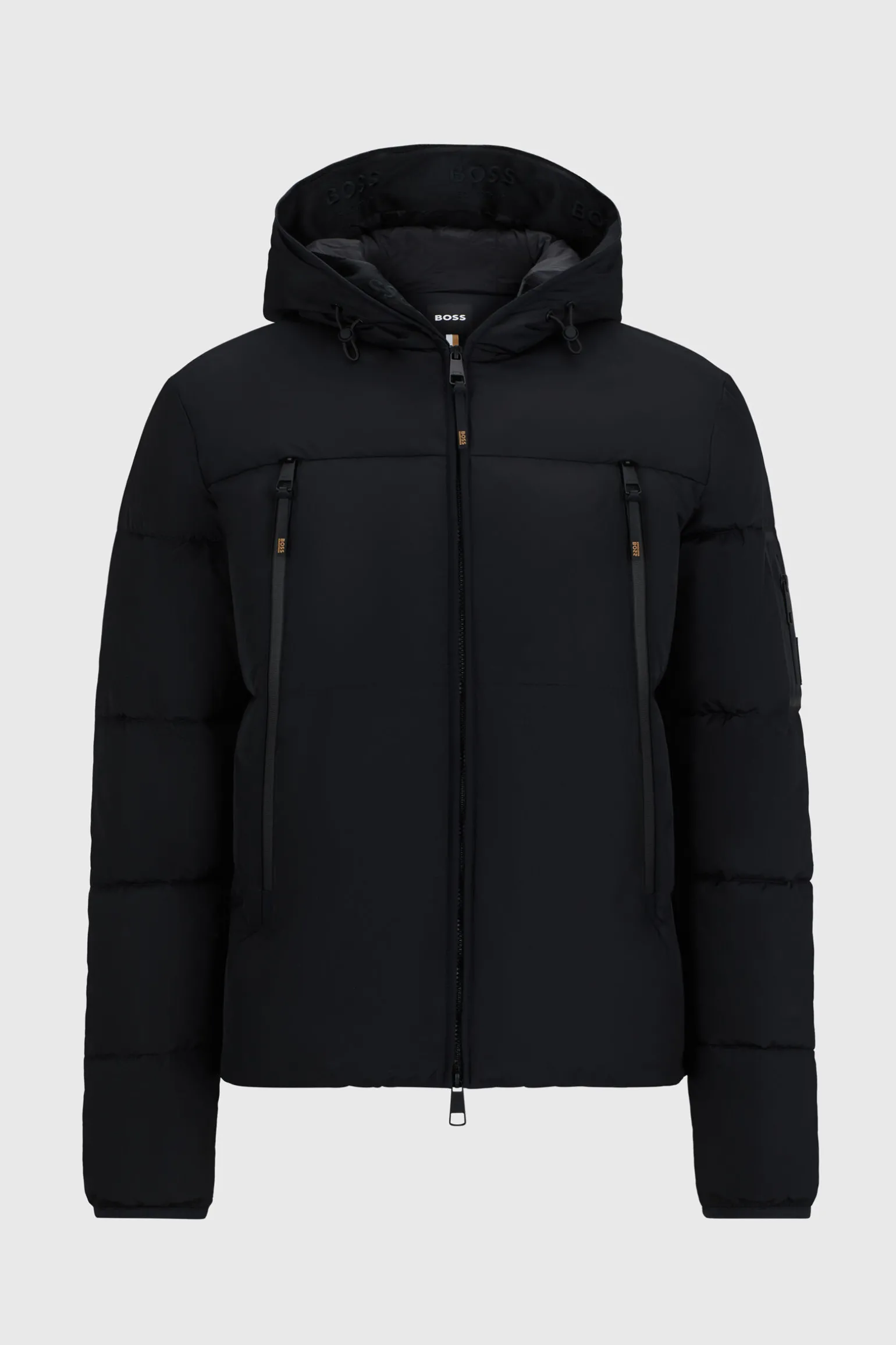 Ultralett, men varm pufferjakke med lange glidelåser foran. Hette med BOSS logotape tone-i-tone svart, toveis glidelås foran.