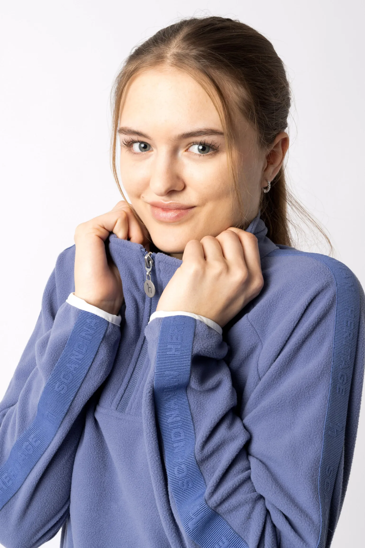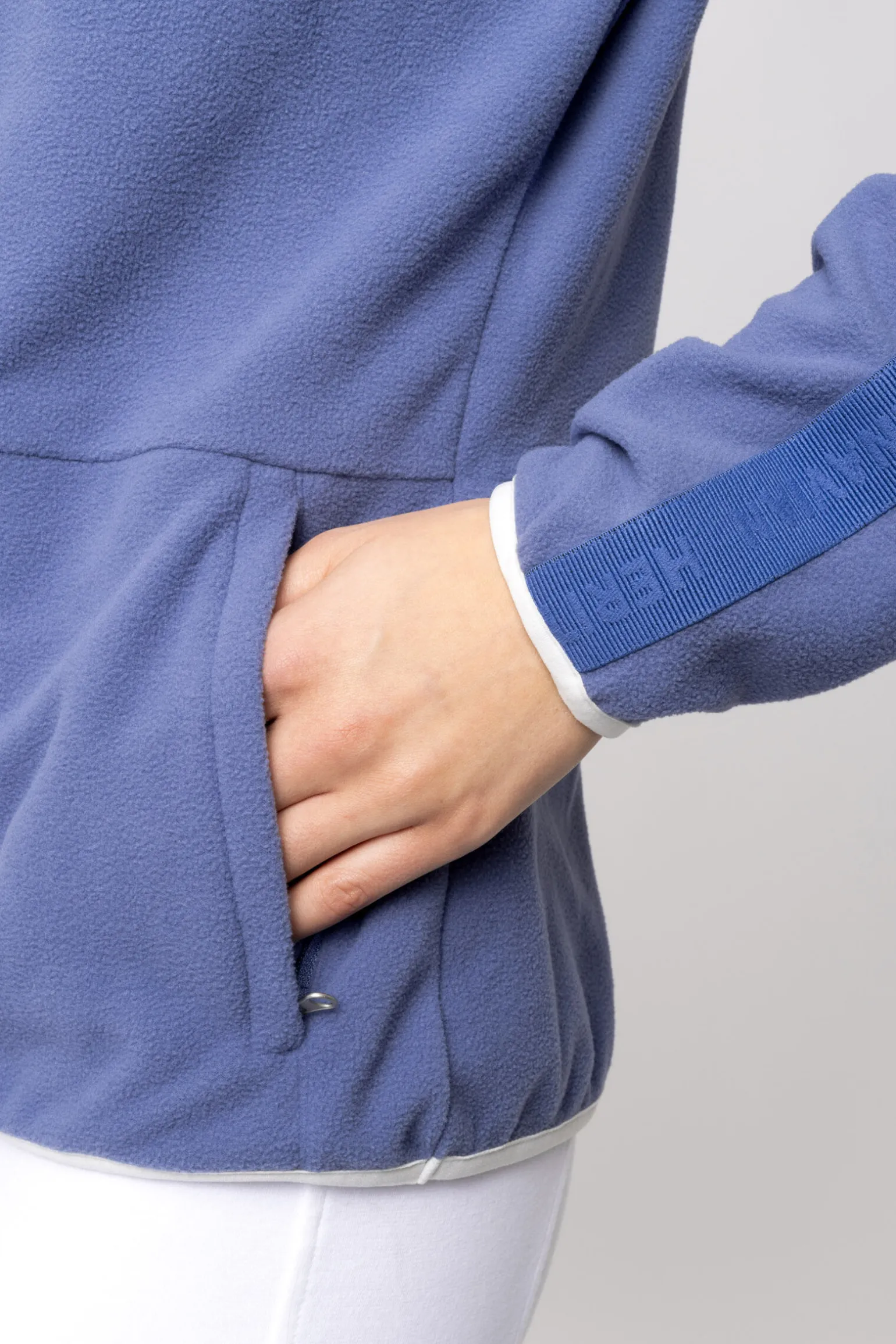 - Mikro fleece polyester. Supermyk. Pustende. Ensfarget logobånd på ermene. Lengre kant bak. Halv glidelås. Justerbar i livet. Glidelåslommer