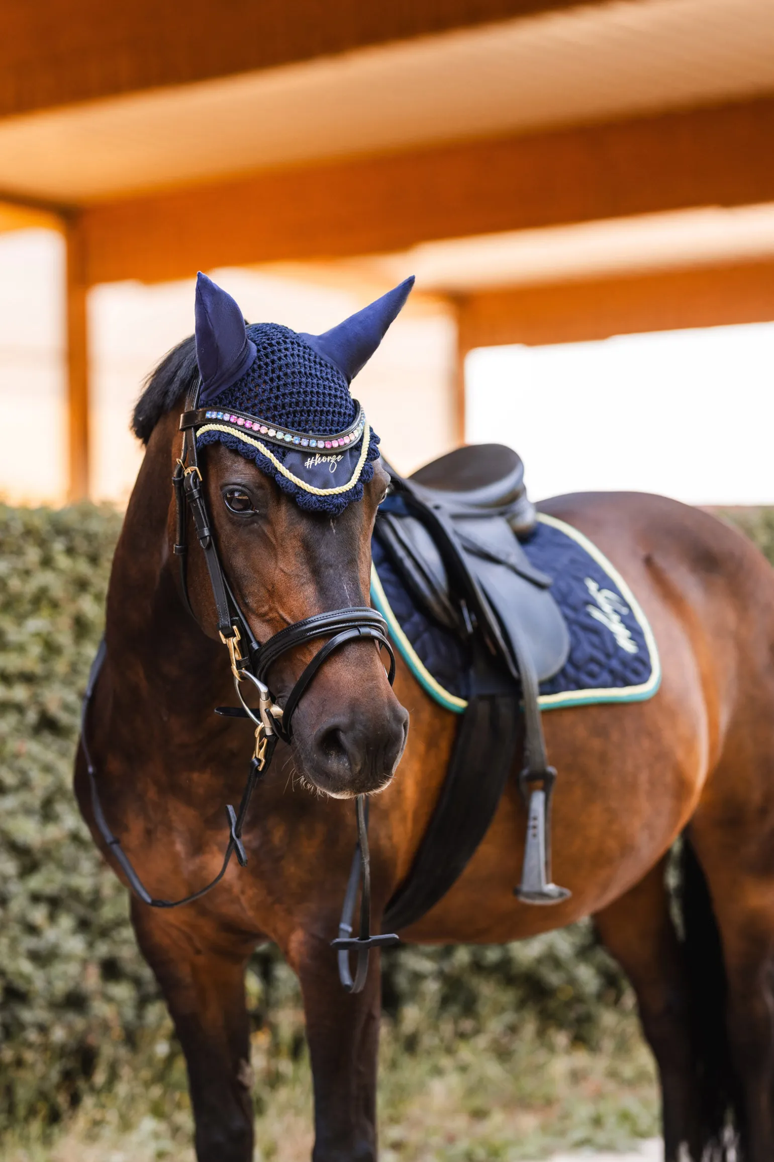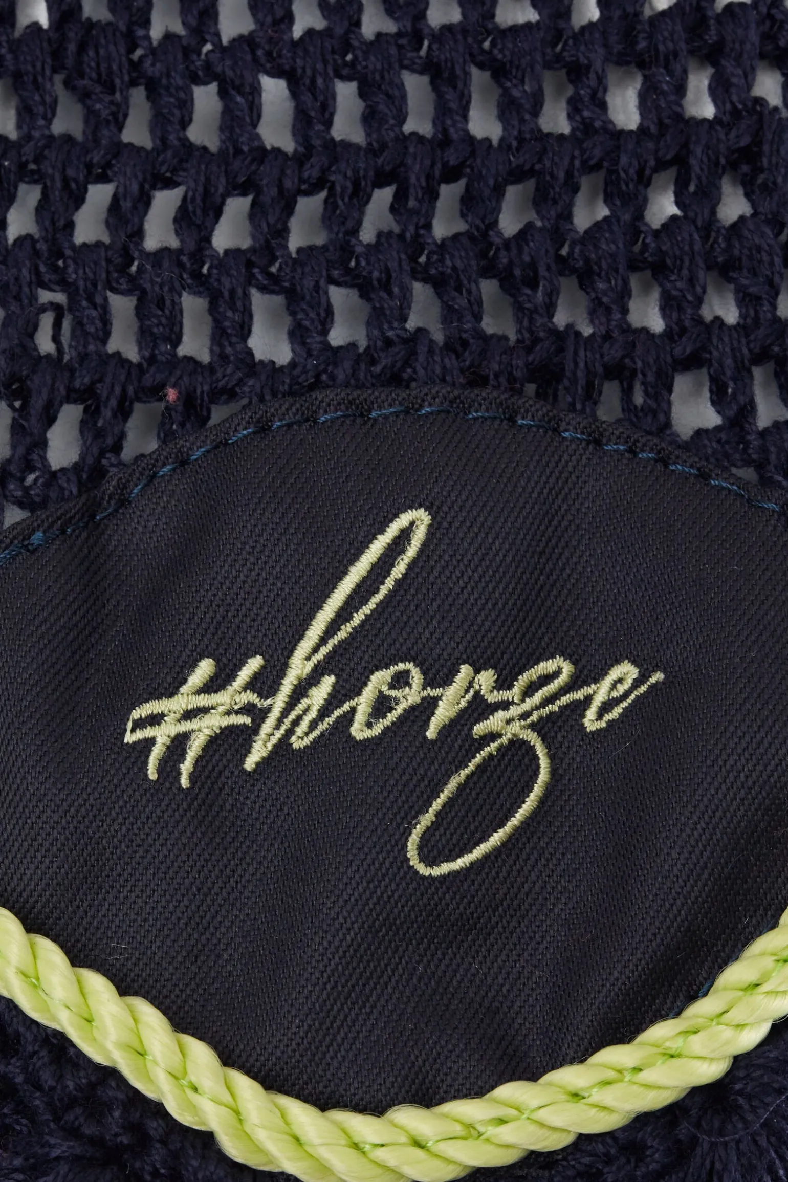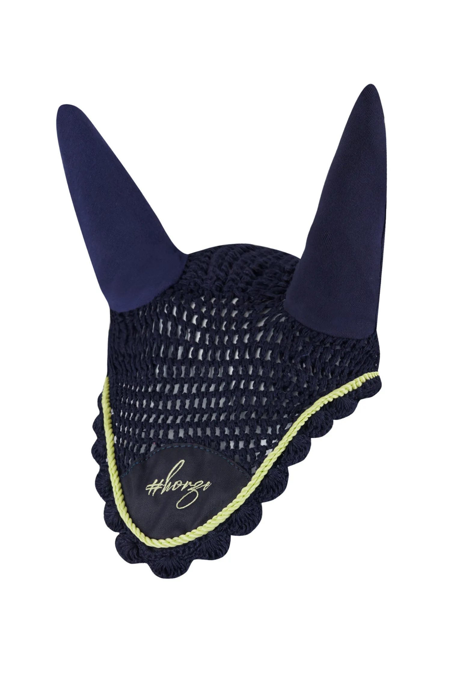 Klassisk heklet hoveddel med #horze broderi. Det elastiske stoffet rundt ørene bedrer passformen og brukskomforten.