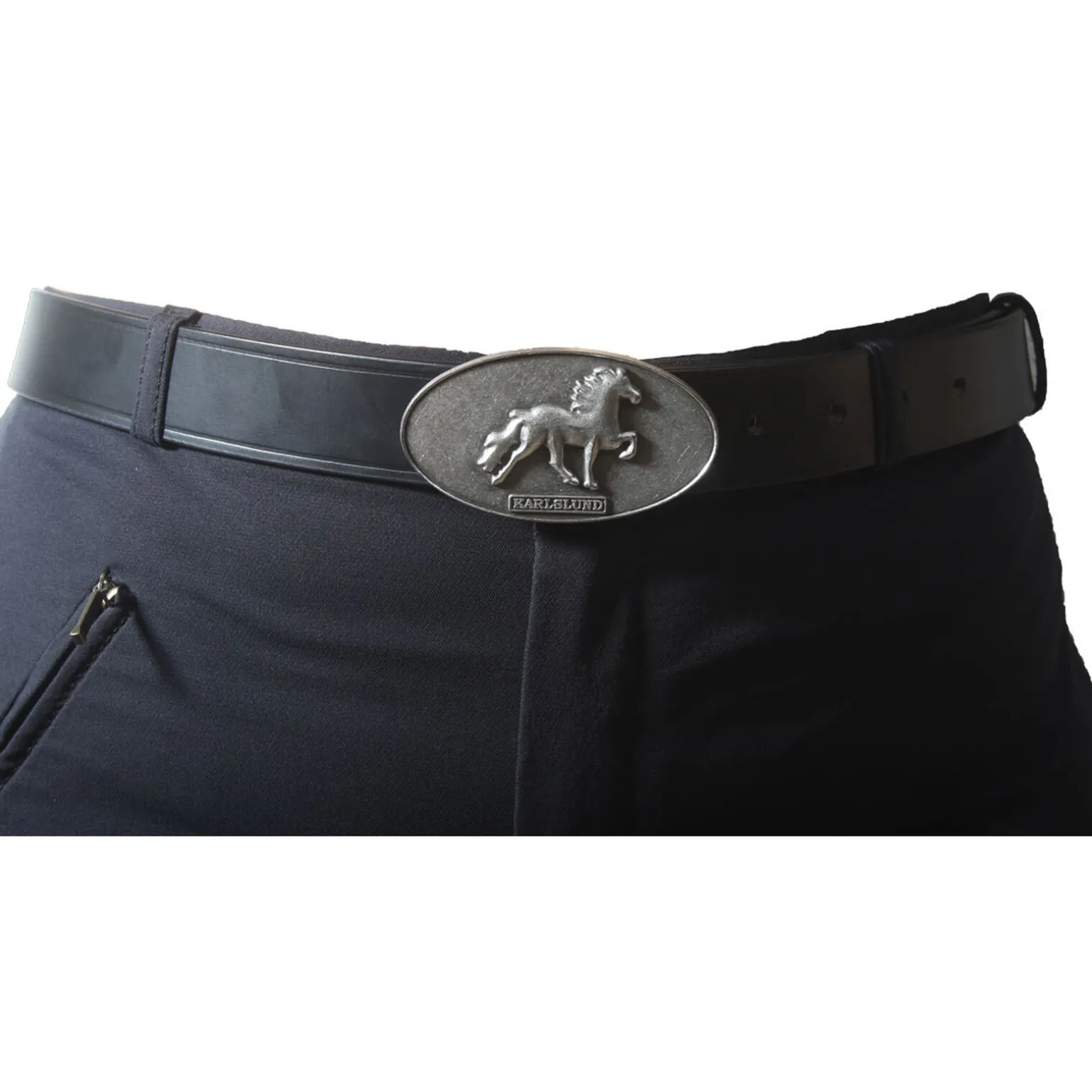 Pent belte i kvalitetsskinn med et vakkert, rustikk islandshest-design på spennen. Passer til Karlslund ridebukse.