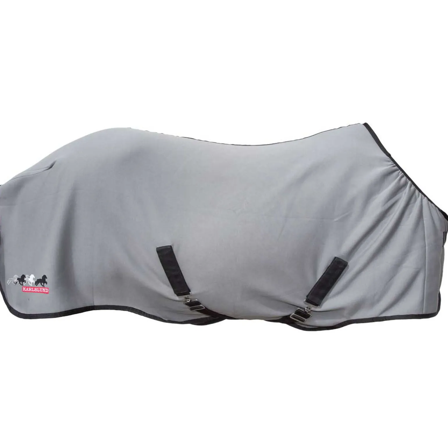 Fleecedekken av høy kvalitet som fuktigheten raskt forsvinner fra. God passform for islandshester, med strikk ved nakken og spesialsnitt ved bena. Med halesnor, avtagbar kryssgjord og broderte islandshester.