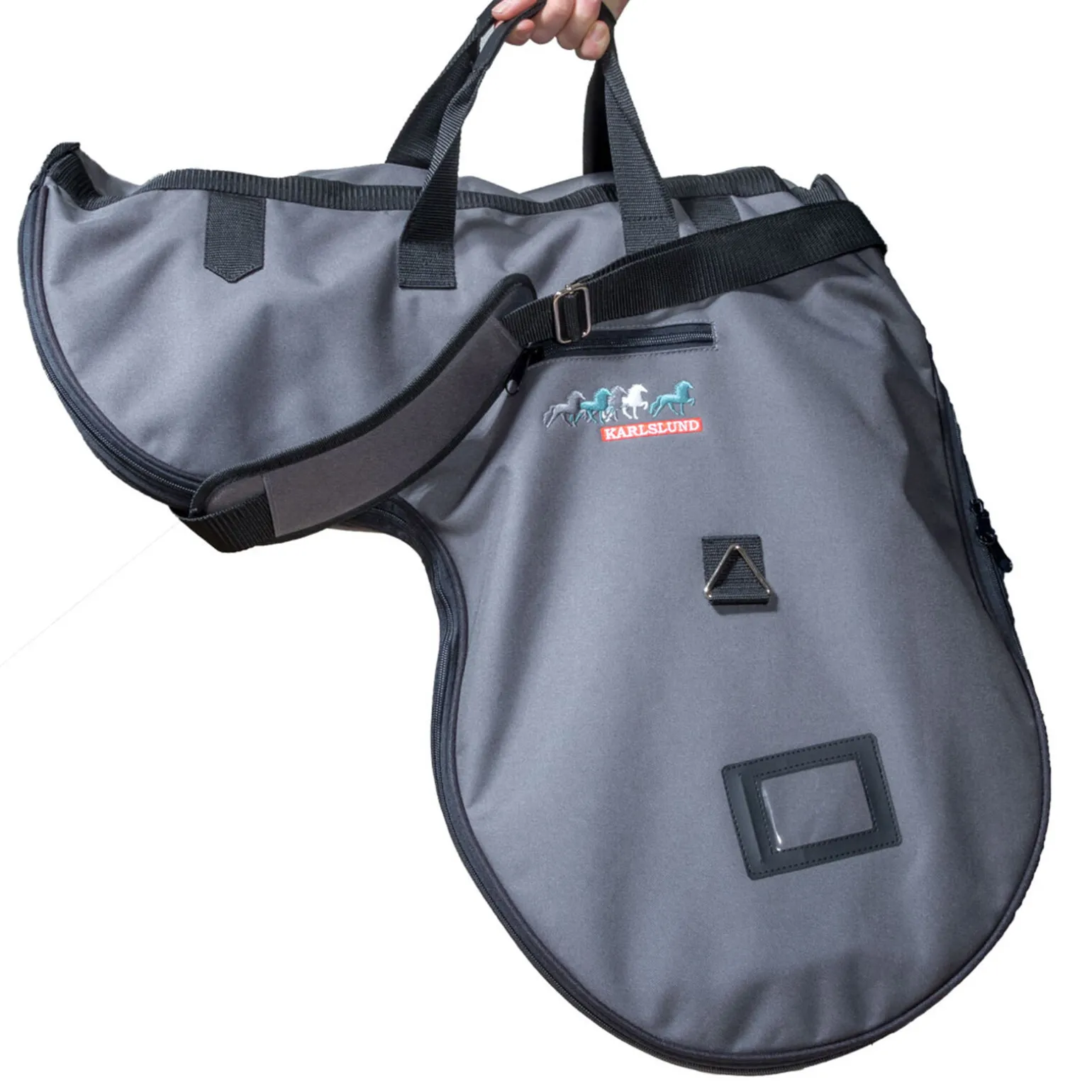 - Kan åpnes helt slik at det er enkelt å putte inn eller ta ut salen. Kommer med håndtak, skulderstropp, lommer og vindu til kort