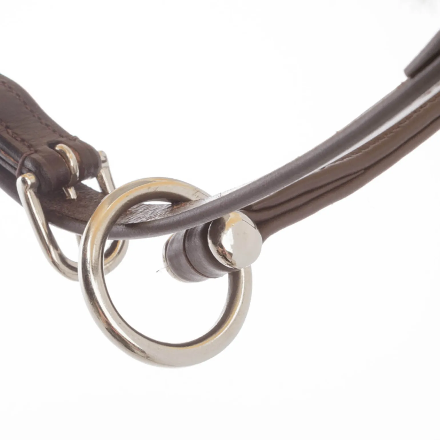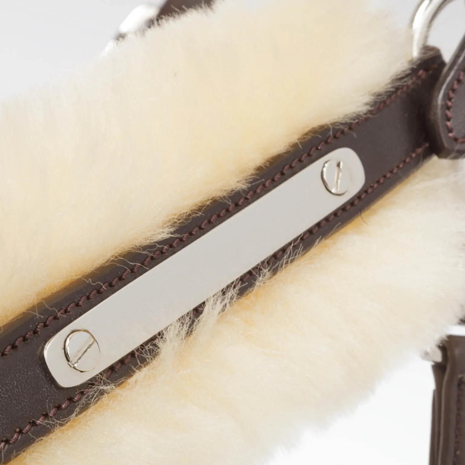 Stilig grime med mykt lær og ekte saueskinn på nakken, nesen og kinnstropper.Saueskinnet kan fjernes med borrelås, slik at du kan vaske det.Grimen kan justeres på begge sider, og ved kinnet for ideell passform.En avtakbar plakett i sølv på venstre sidestykke som kan graveres, slik at grimen kan personaliseres.