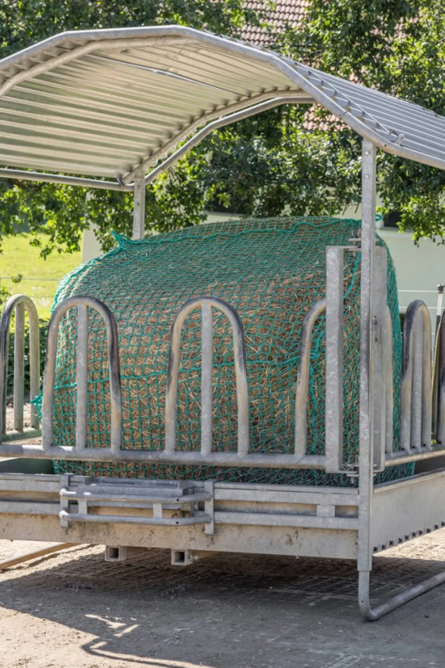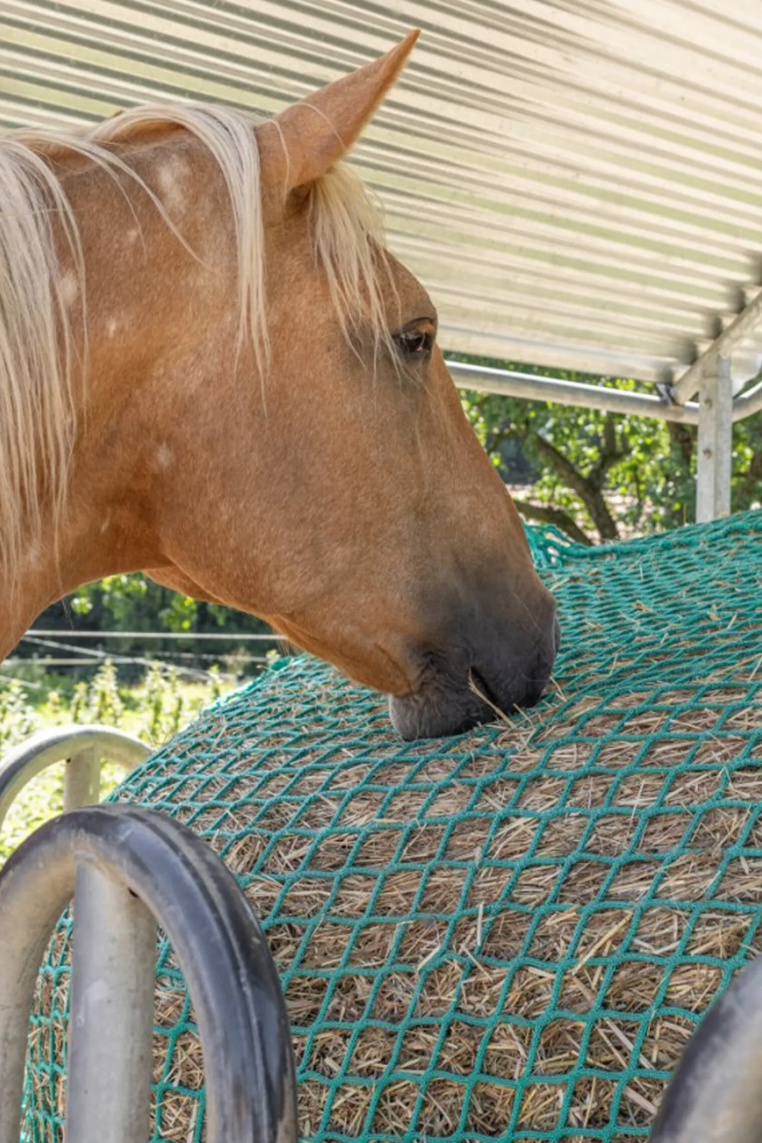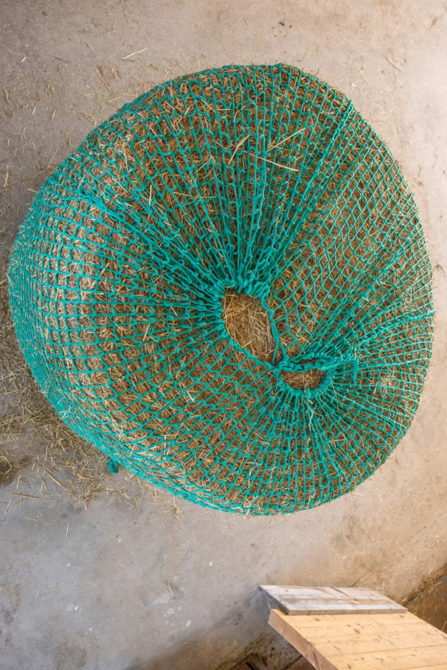 Hengende fôrnett for høy- og siloballer for fôrbesparende grovfôrsforsyning til hester.