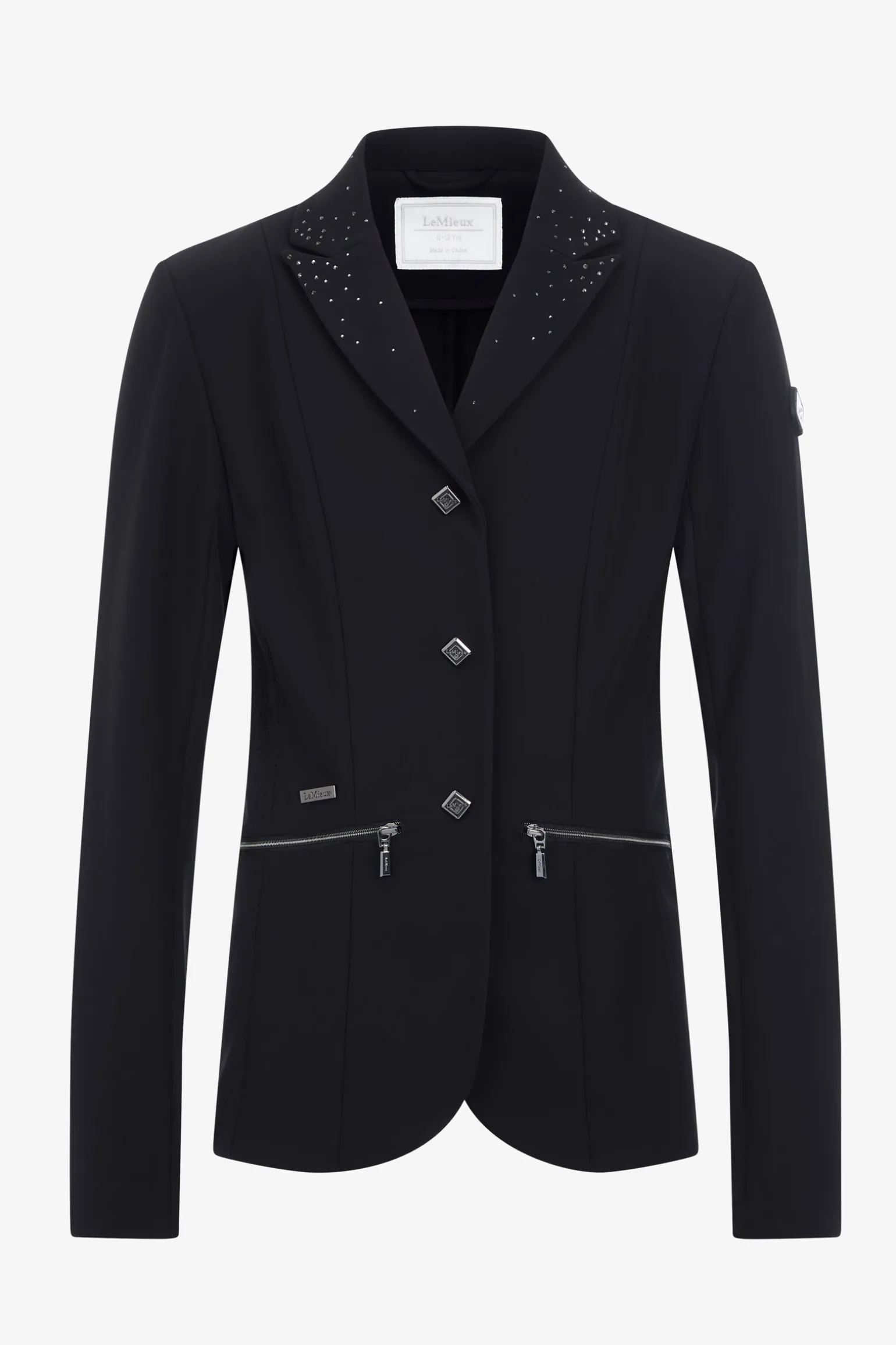 Den karakteristiske LeMieux premium stevnejakken, tilpasset for unge ryttere, har sofistikerte krystaldetaljer på kragen, bakbeltet og delte haleender. En slitesterk frontglidelås og karakteristiske LeMieux-merkede trykknapper fremhever det høykvalitets håndverket. Perforerte sideventiler foret med ytelsesnett sikrer komfort og pusteevne. Romslige sidelommer med glidelås gir rikelig med lagringsplass. Subtile LeMieux-merkede finishdetaljer på hoften og armen fullfører designet.