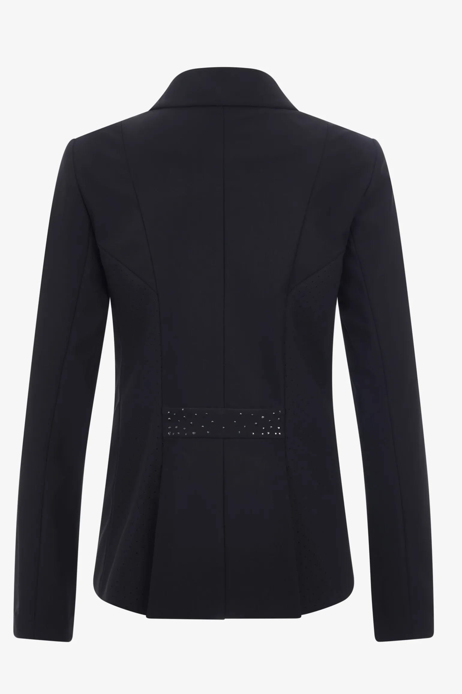 Sofistikert stevnejakke med krystaldetaljer på kragen, bakbeltet og på spissen av delt hale