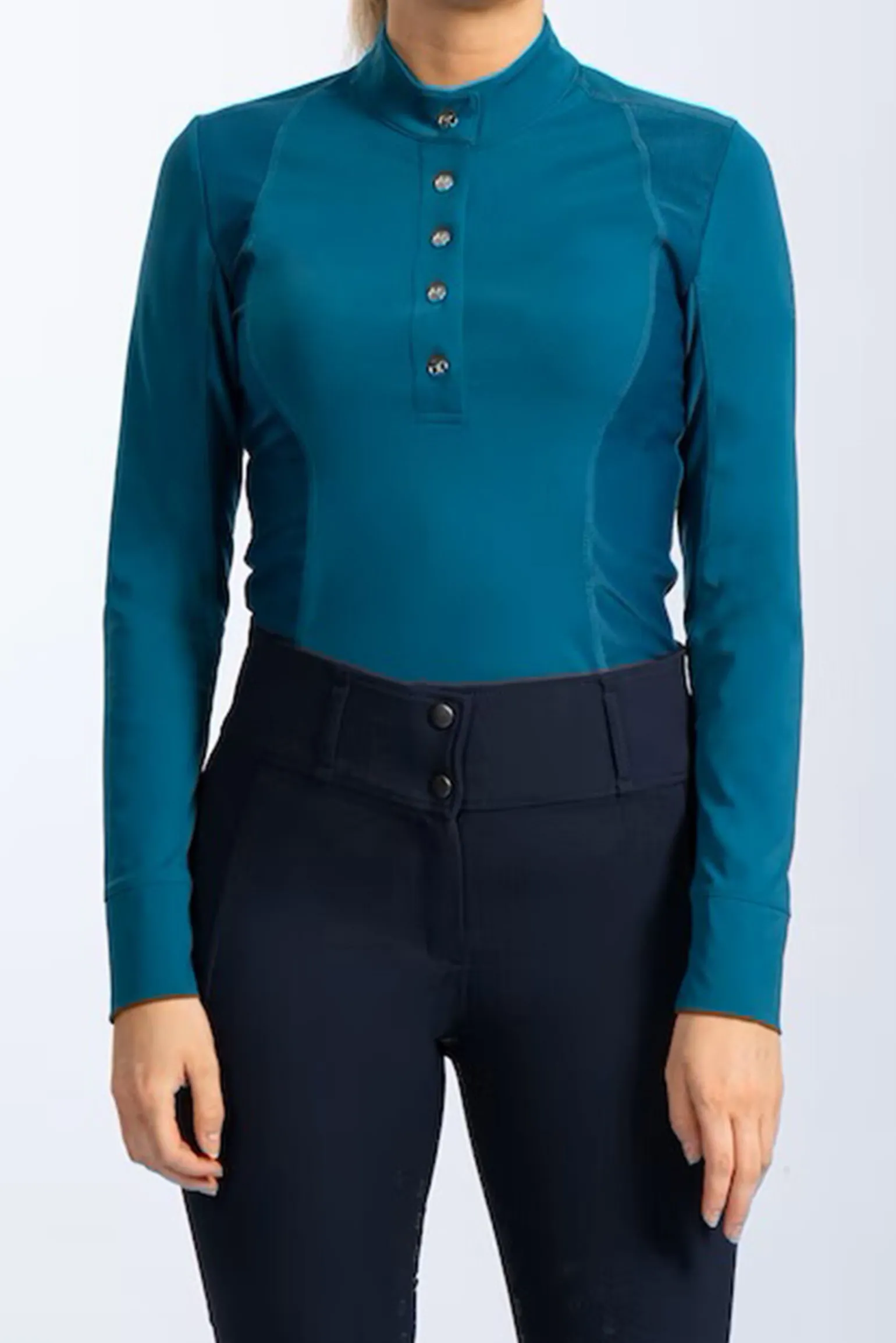 Et langermet baselag, laget i teknisk polyamidblanding, og med pustende meshpaneler.Plagget har stilige og funksjonelle egenskaper, som en stående krage med halv knappestolpe, dekorative sømmer og ensfarget PS-monogram trykket på brystet.