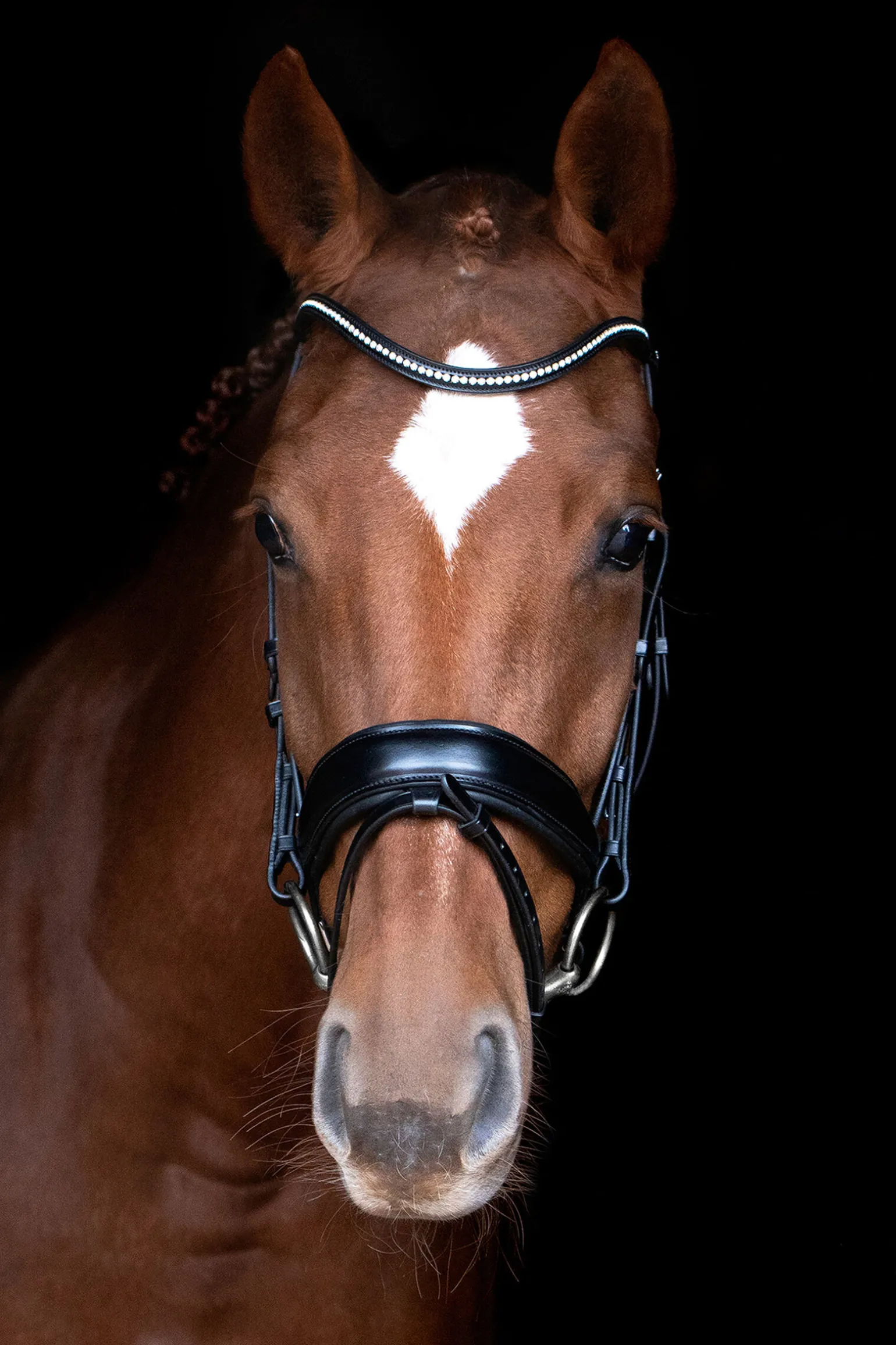 STANFORD kombinerer funksjonalitet og sportslig design: Hodelaget med anatomisk formet pullback-nesereim har et unikt nakkestykke. Dette er særlig formet etter hestens anatomi og gir ubegrenset bevegelsesfrihet til ørene. På grunn av reduksjon av trykk på sensitive områder rundt kinnbein og nakke er hestens komfort betydelig forbedret. STANDFORD kommer med to pannebånd: Ett enkelt pannebånd i lær og et med et smalt krystallkjede.FS-XL er kun tilgjengelig i svart/sølv.