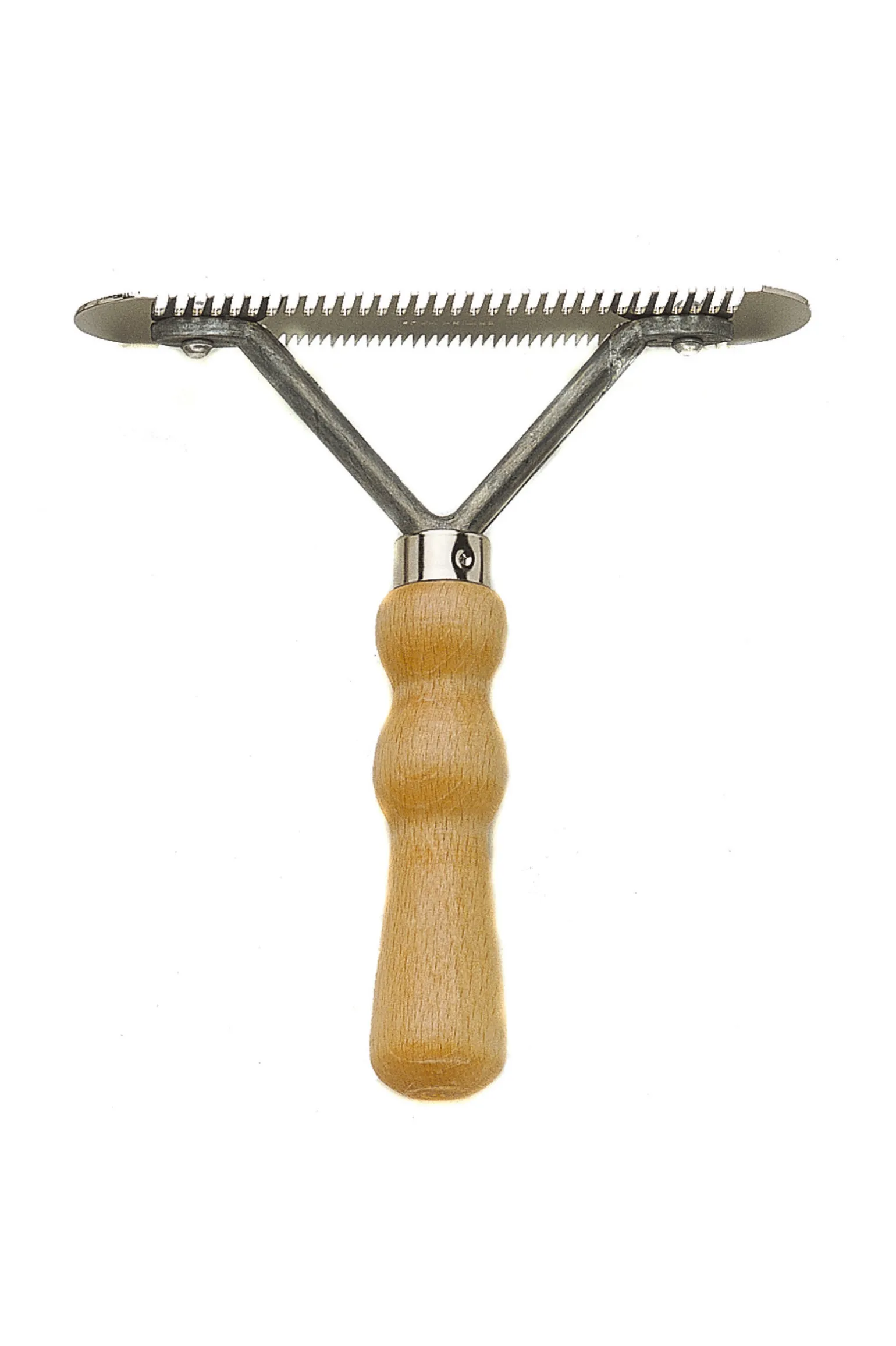 Forniklet stålblad med doble tenner. Polert trehåndtak.
